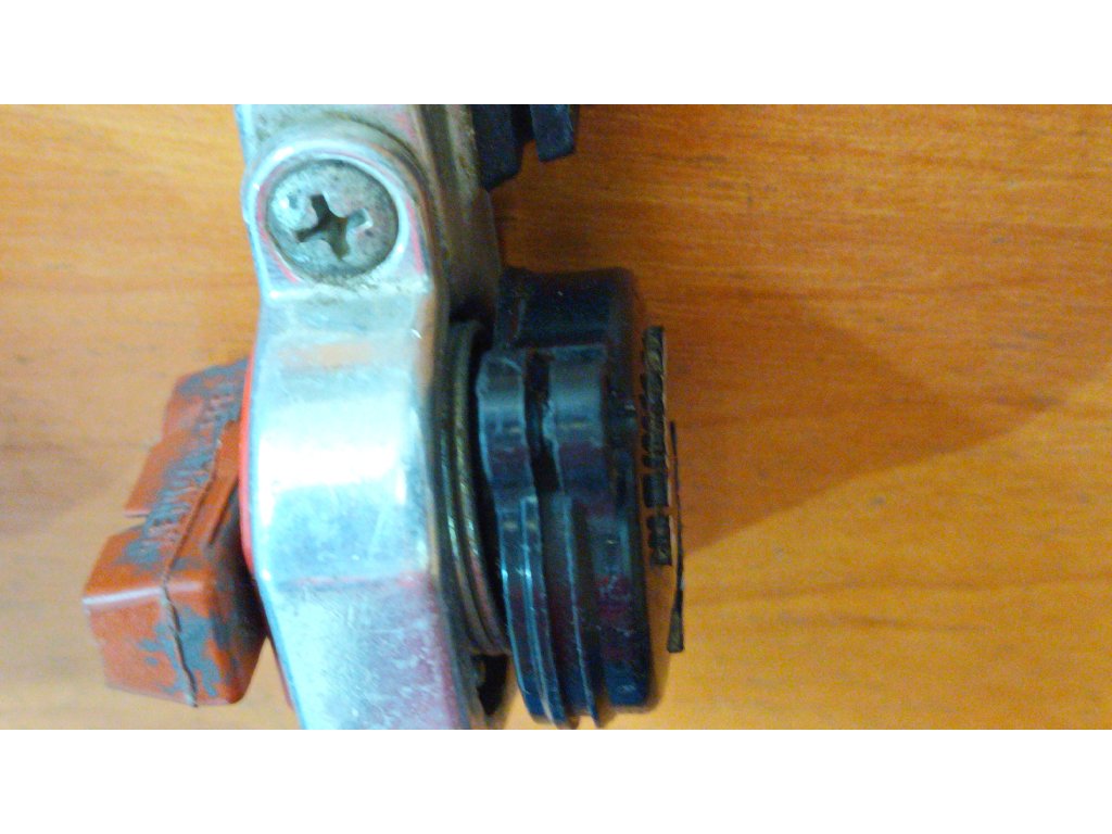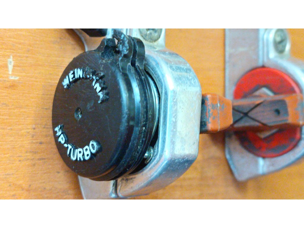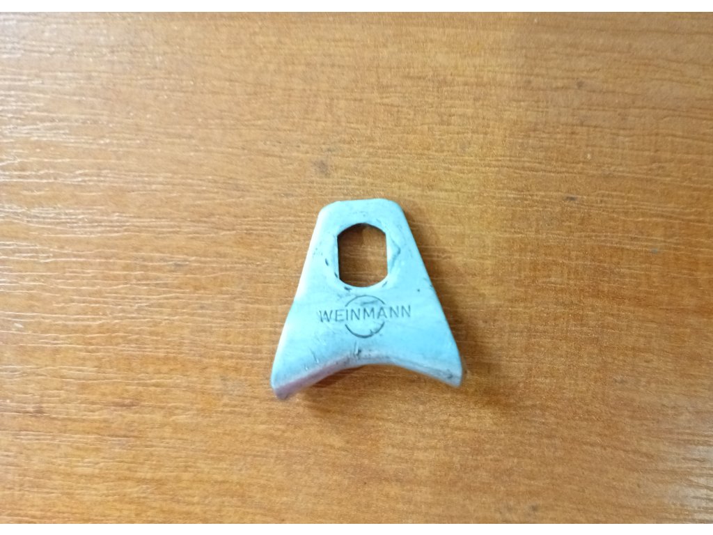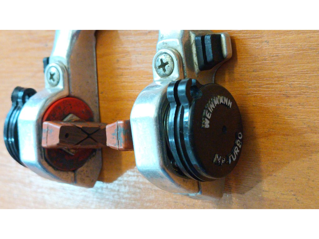 Použitá vintage raritní brzdová čelist švýcarského výrobce Weinmann HP-Turbo, chybí tažné lanko, šroub uchycení k rámu. Částečně poškozená plastová část pro uchycení lanka, nelze určit, zda má vliv na funkčnost. Vyráběno od roku 1984.
