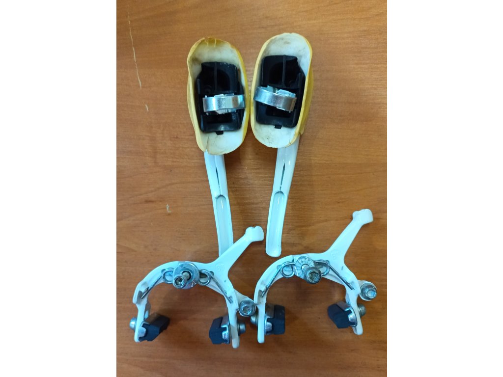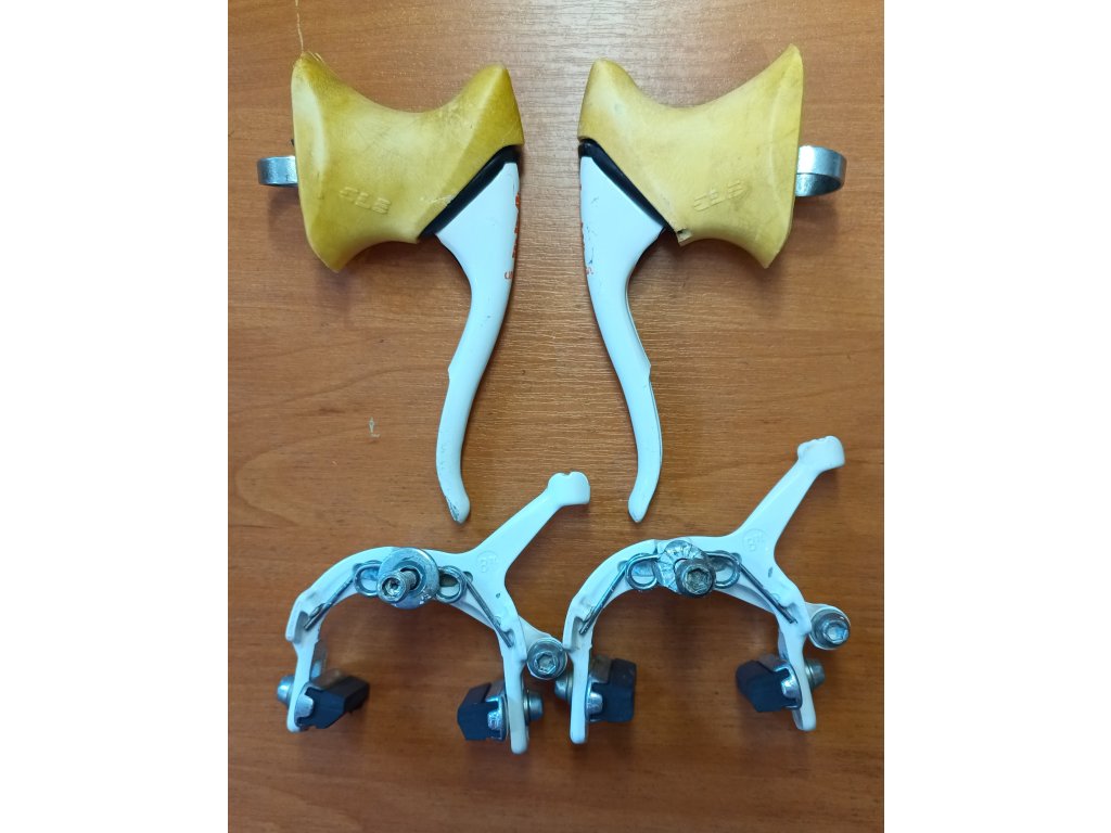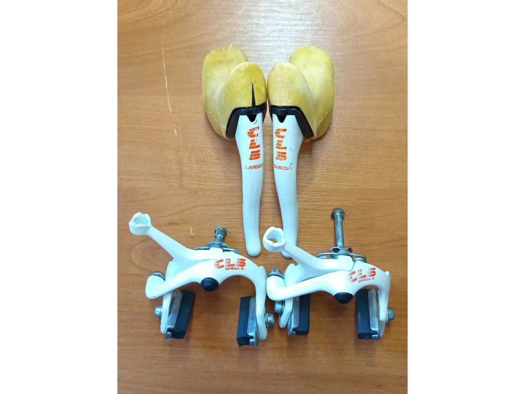 Vintage silniční brzdové páky a čelisti francouzkého výrobce CLB Omega. Velmi hezké a funkční, jen gumy na pákách jsou v horším stavu.