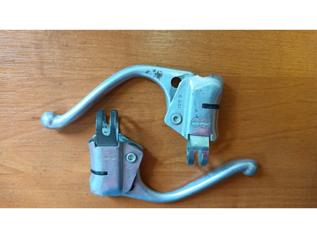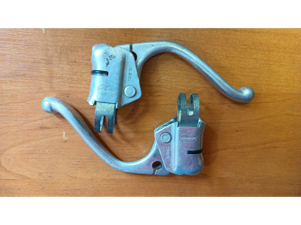 Použité brzdové páčky výrobce z NDR Altenburger. Funkční, ale chybí dorazy bowdenu.