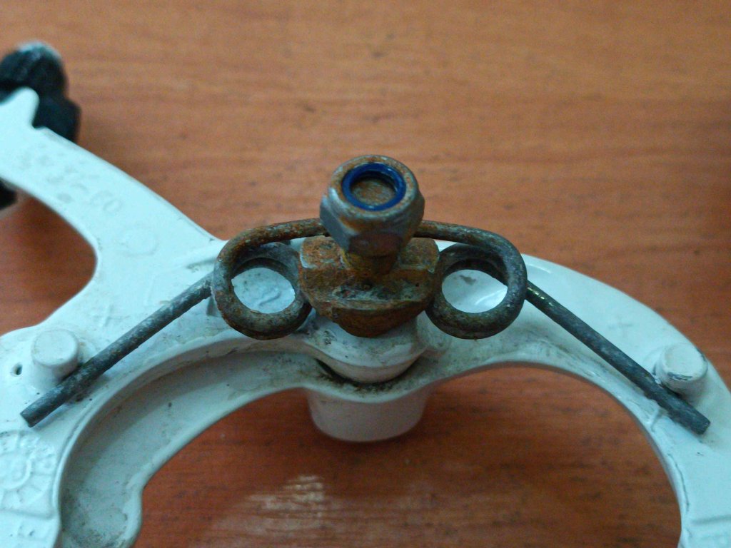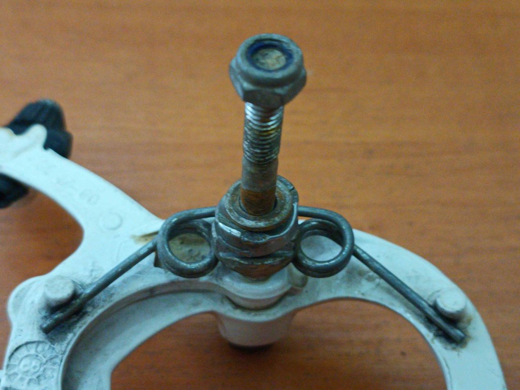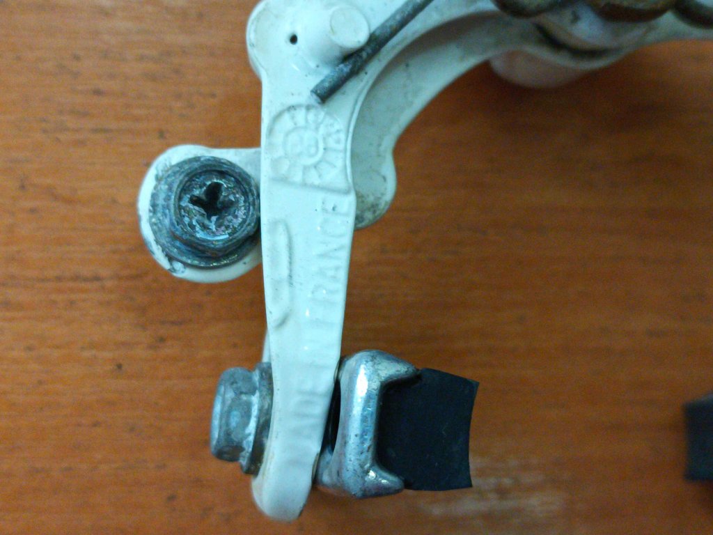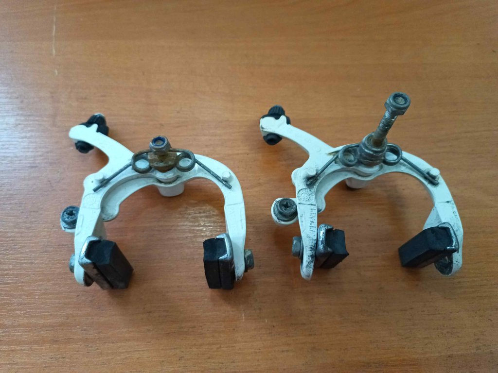 Vintage silniční ojedinělé brzdové čelisti francouzkého výrobce CLB GL 47-60 v bílé barvě. Chybí jeden plastový kryt šroubu, známky koroze na šroubech, jinak funkční.