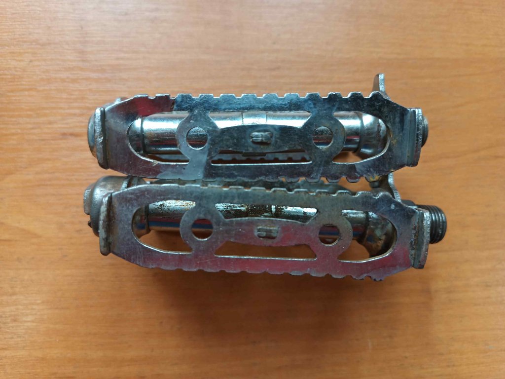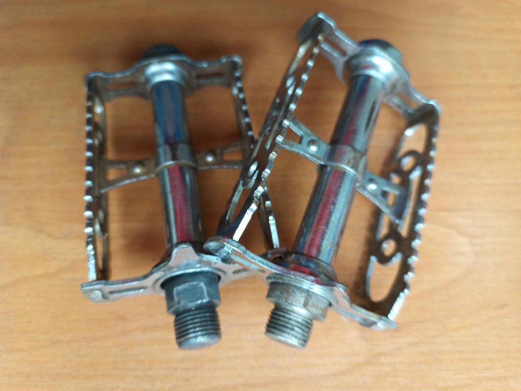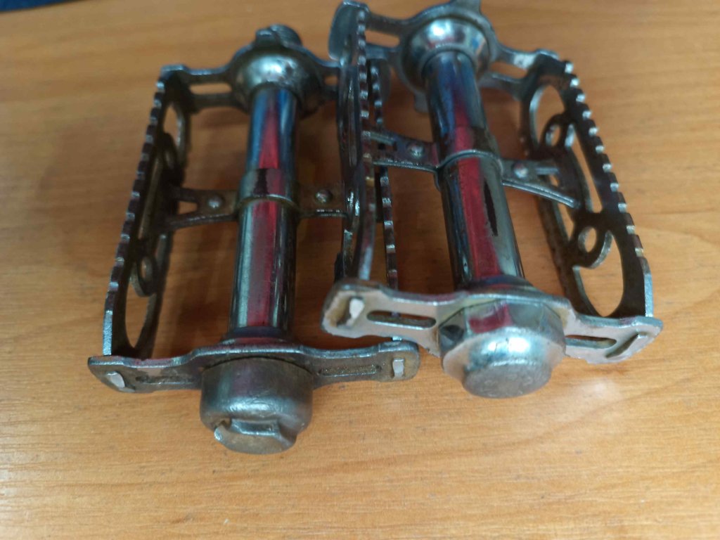Použité vintage ocelové pedály francouzského výrobce Lyotard 460A z 60.-80. let minulého století. Jedna osa není původní, původní je ta s kratší krytkou - nápis LYOTARD. U obou pedálů mírná vůle a známky koroze.
