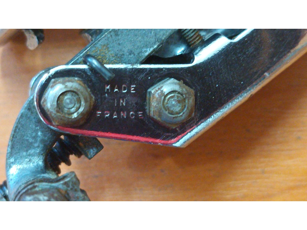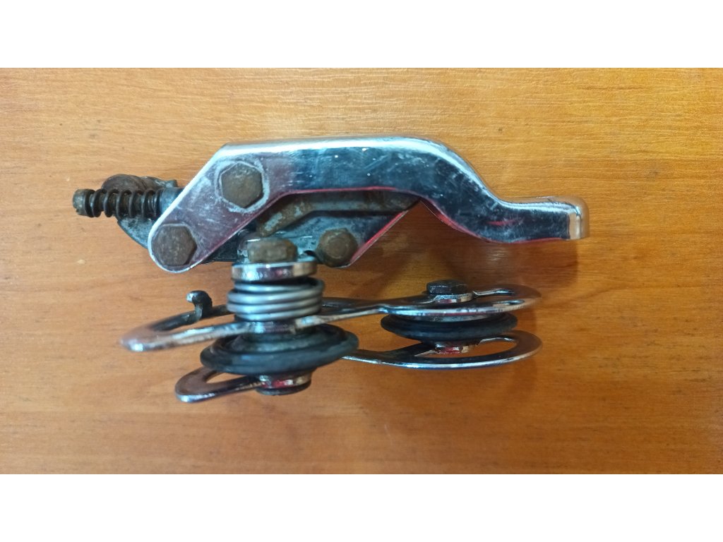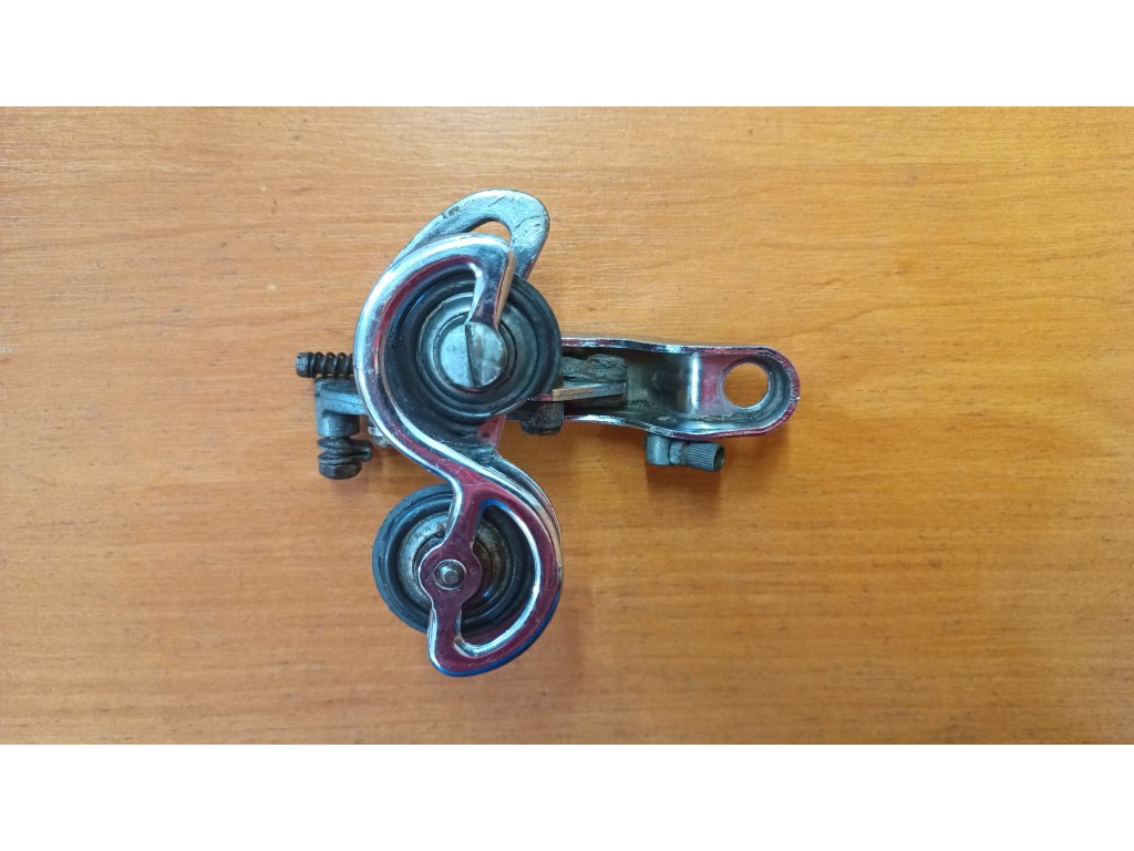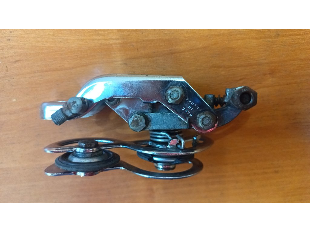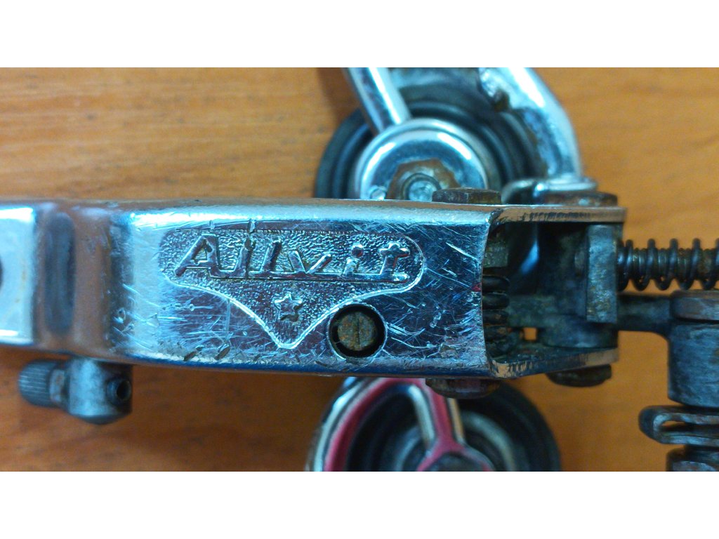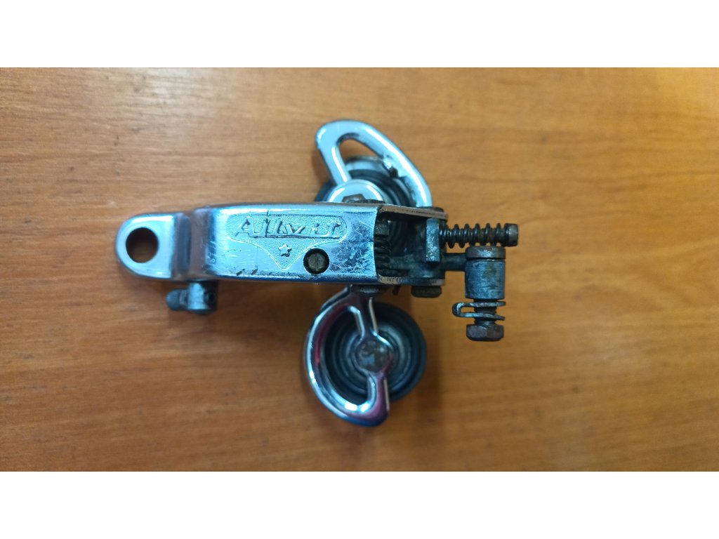 Použitá historická přehazovačka francouzského výrobce Huret Allvit ze 70. let minulého století. Chybí hák a jedno vodící kolečko má ulomenou plastovou část viz foto. Jinak funkční.