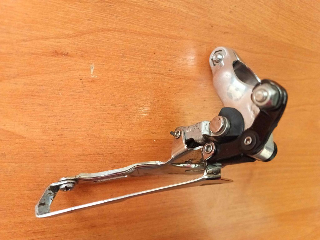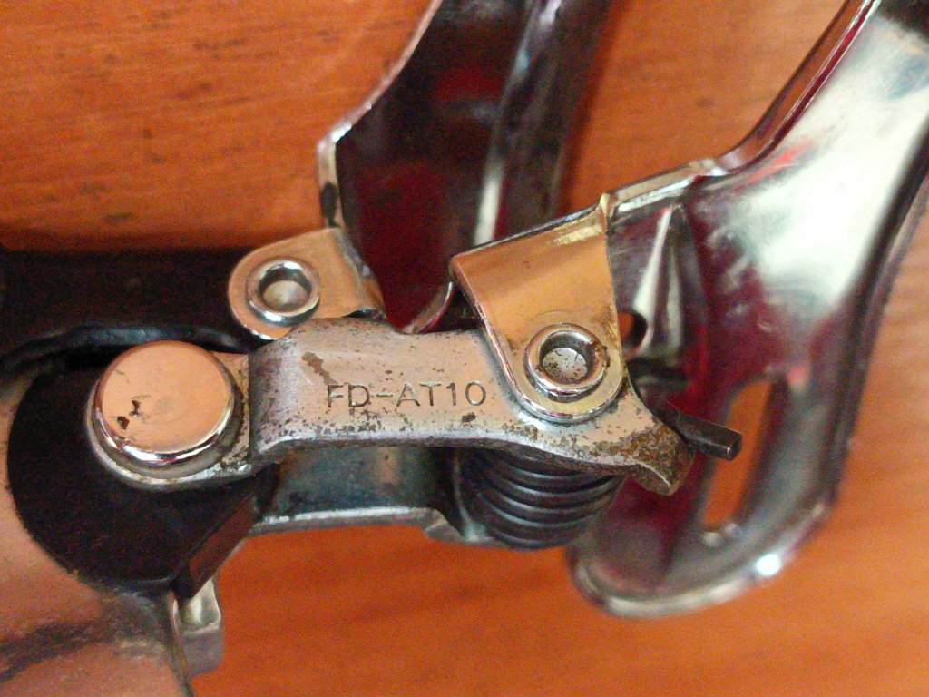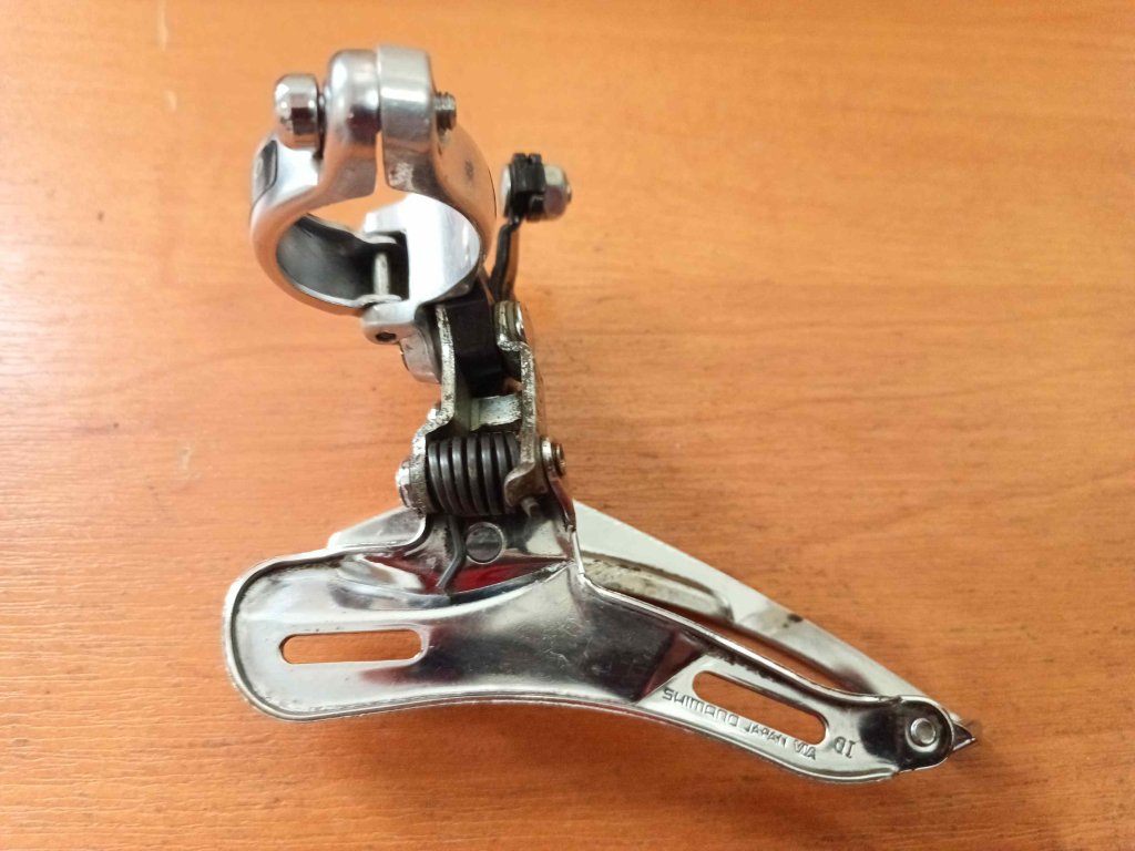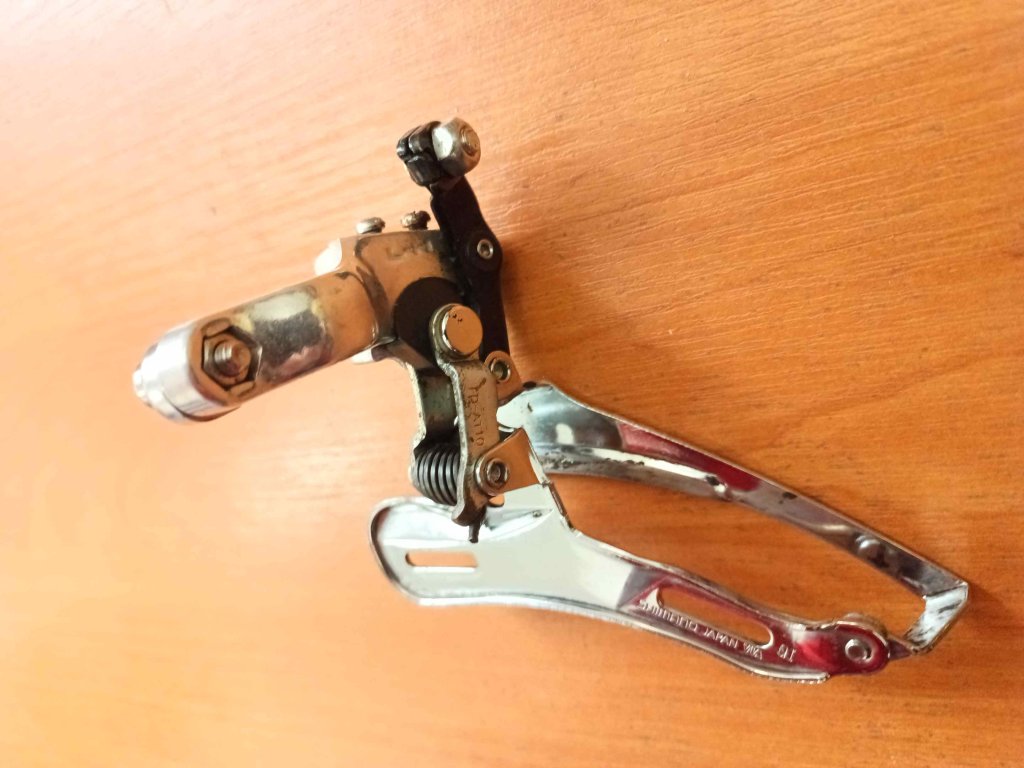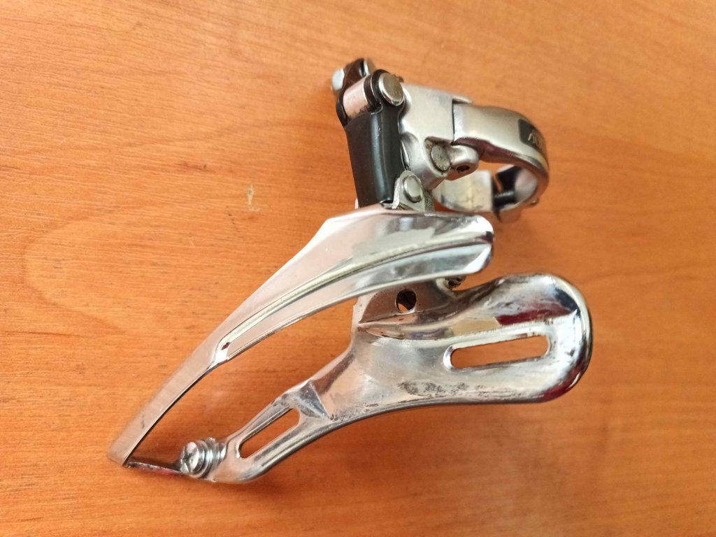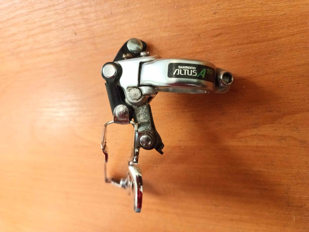 Použitý vintage přesmykač pro MTB, Shimano Altus A10 (FD-AT10), spodní tah. Zachovalý, funkční.