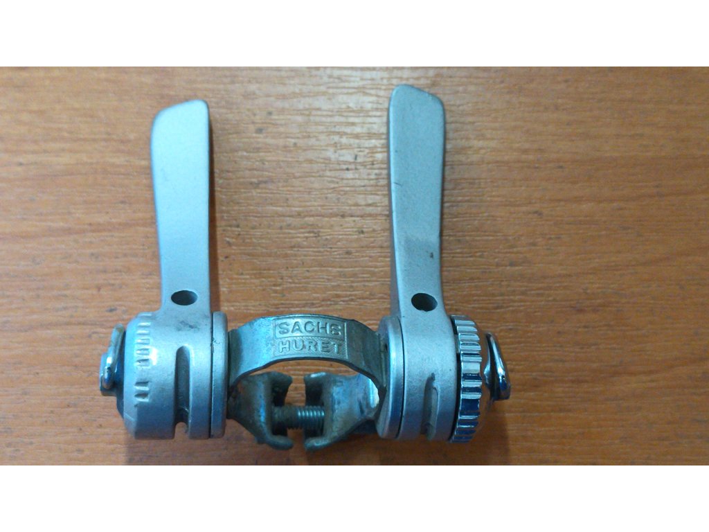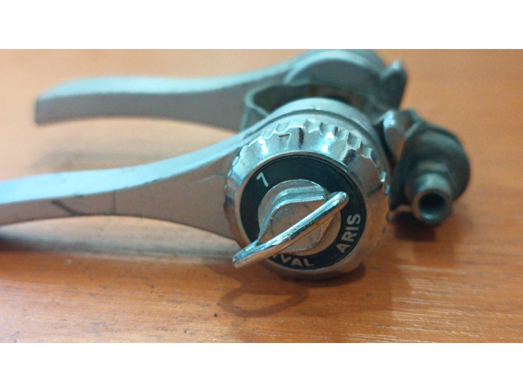Použité vintage řadící páčky Sachs Huret Rival Aris s indexováním pro 7 rychlostí. Vyráběno od konce 80. let minulého století. Kompletní, funkční.