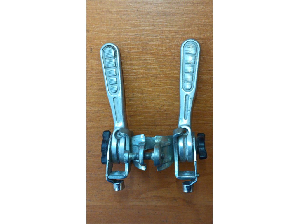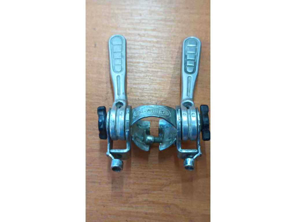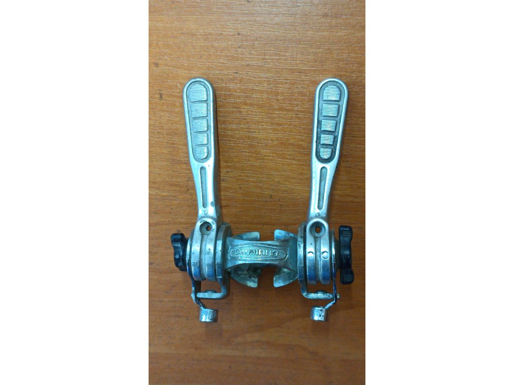 Použité vintage řadící páčky Shimano LB-150, zachovalé, kompletní, funkční. Vyráběno ve druhé polovině 70. let minulého století. Tyto jsou vyrobeny v Singapuru.