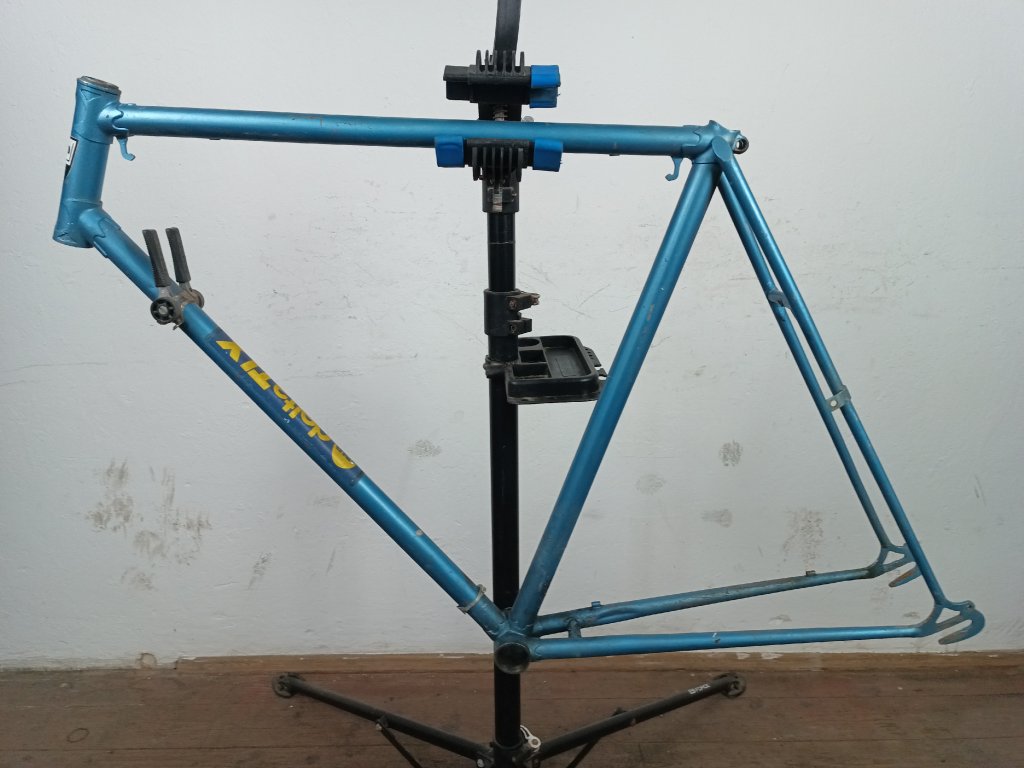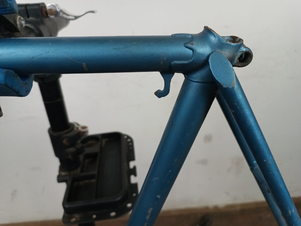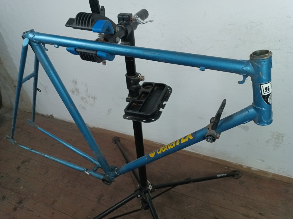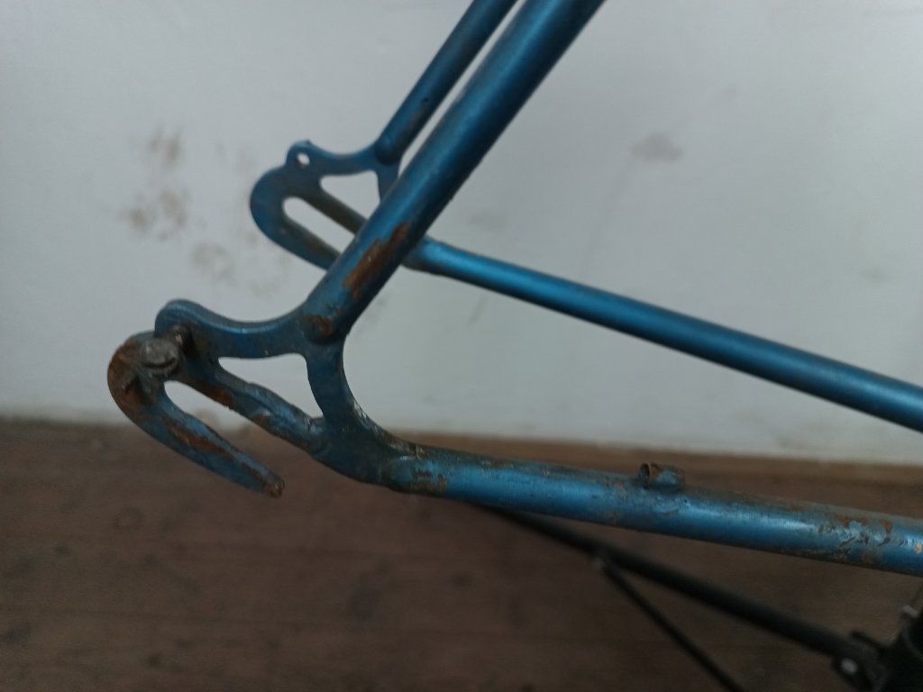 Použitý silniční rám set Favorit F 12, velikost 58 cm. Nekované patky, na zadní stavbě jedna patka zavařená. Vybroušené výrobní číslo, na středu vyražené písmeno N.