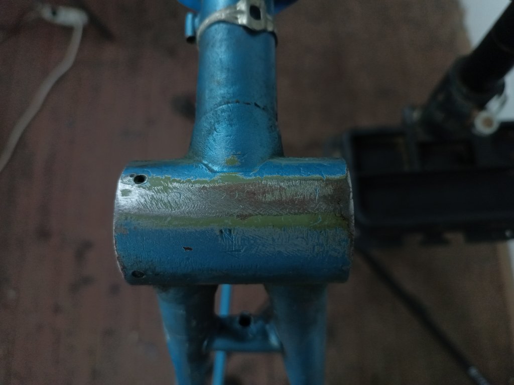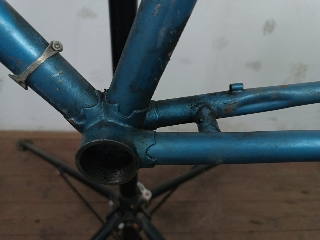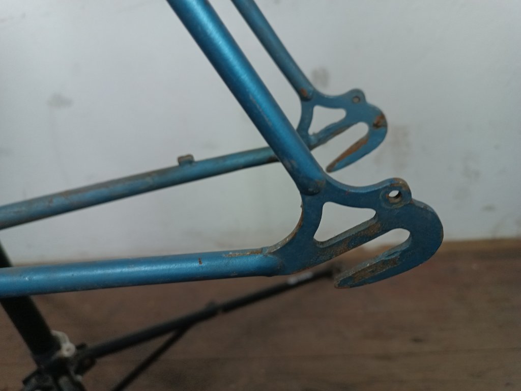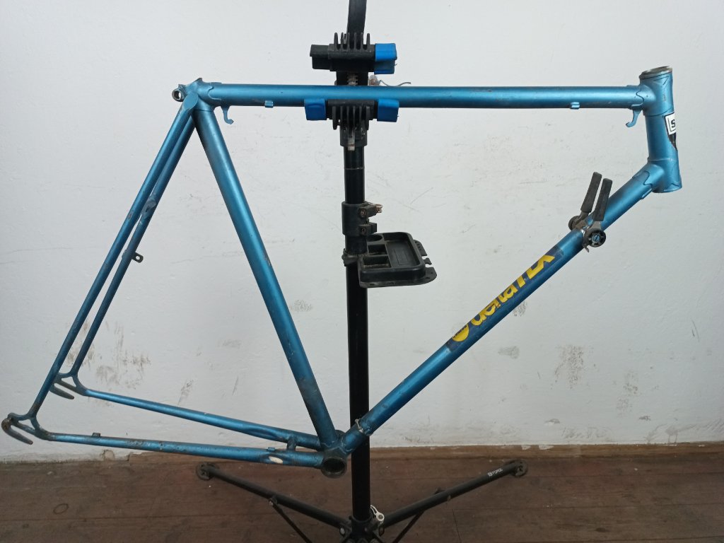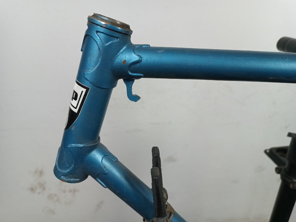 Použitý silniční rám set Favorit F 12, velikost 58 cm. Nekované patky, na zadní stavbě jedna patka zavařená. Vybroušené výrobní číslo, na středu vyražené písmeno N.