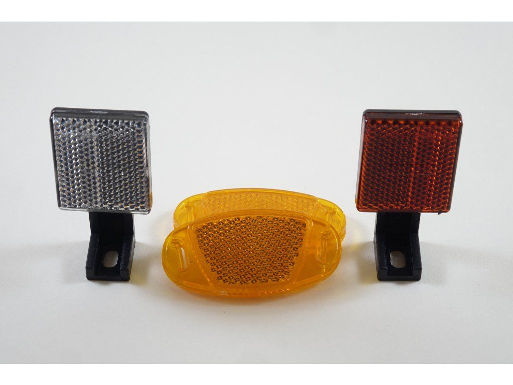 Nepoužitá sada odrazek, bílá dopředu, červená dozadu, oranžové do výpletu ráfků. Bez šroubů a bez držáků k rámu kola.