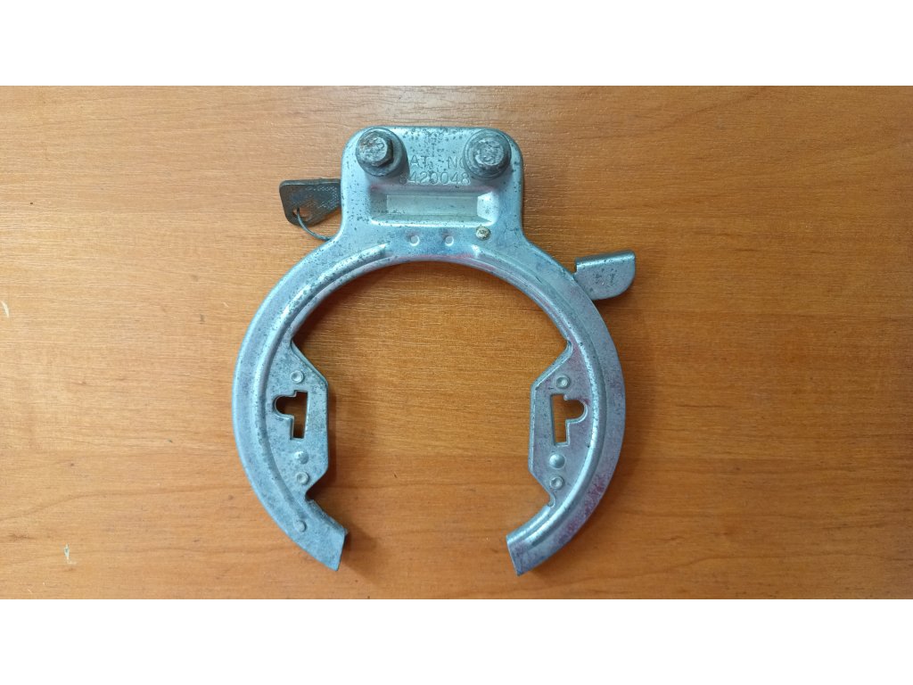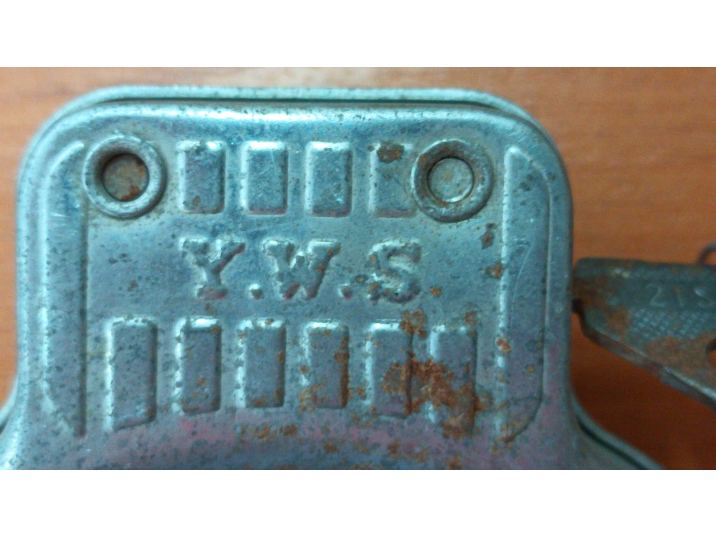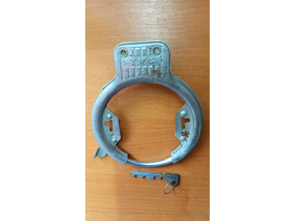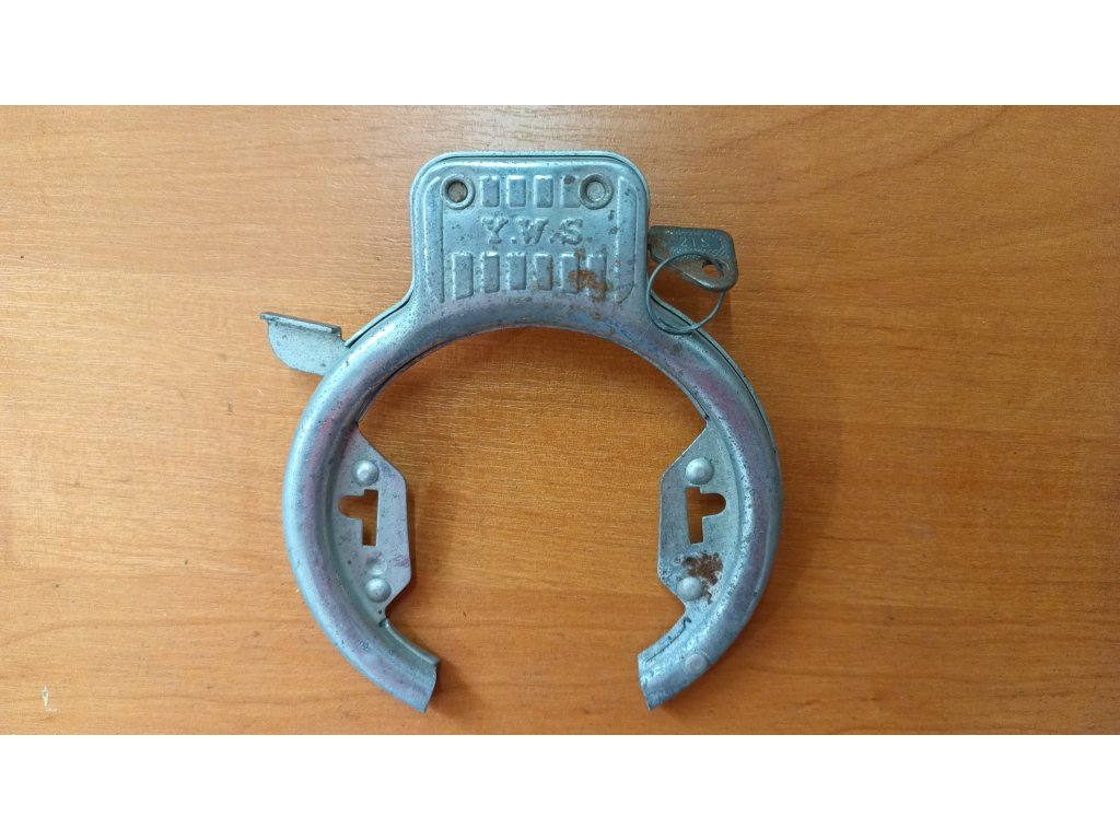 Použitý vintage zámek čelisťový YWS, slouží k připevnění k vidlici a jednoduchému a rychlému uzamčení kola přes ráfek. K dispozici pouze jeden klíč. Zámek je funkční, má známky koroze viz foto.