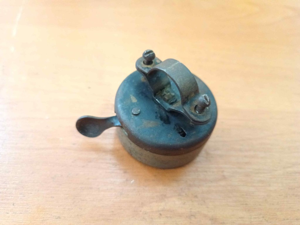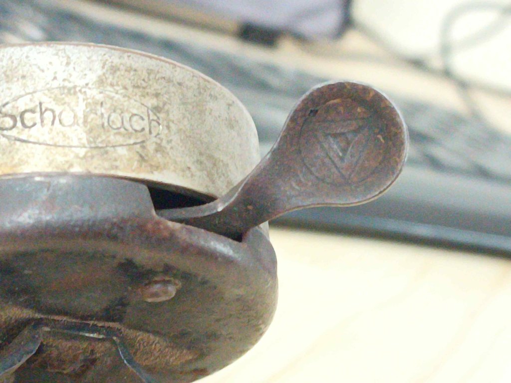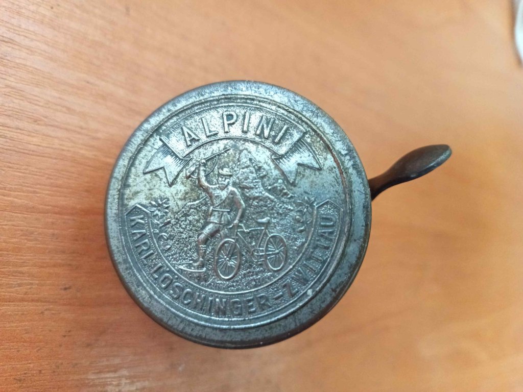 Použitý krásný historický zvonek německého výrobce Scharlach, zřejmě z doby před 2. sv. válkou. Není jisté, zda spodní a horní část patří k sobě. Bude nutné si pohrát s mechanikou, aby spolehlivě zvonil, trochu se zasekává.