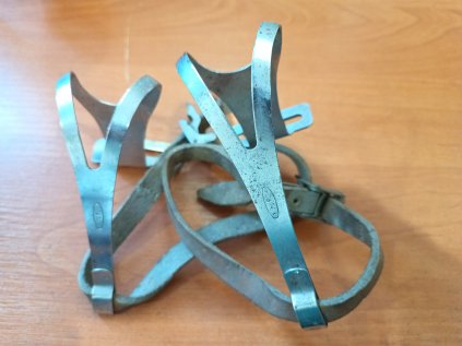 Použité klipsny Juro s řemínky - novější typ. Zachovalé. Chybí jeden protikus k upevnění na pedál.