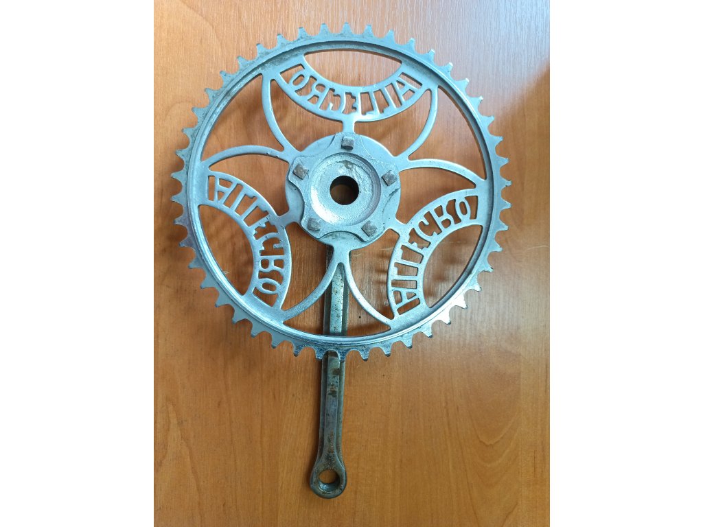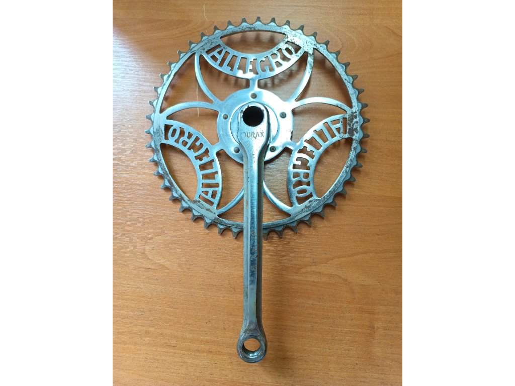 Použitá historická klika na klínek francouzského výrobce. Kliky Durax patřily ve své době mezi nejkvalitnější francouzké komponenty pro jízdní kola a vyráběly se zřejmě již počátkem 20. století, pravděpodobně do 60. let. Počet zubů 46, délka kliky 170mm. Stav viz foto, převodník je poněkud vyhnutý v místě nápisu "Allegro".