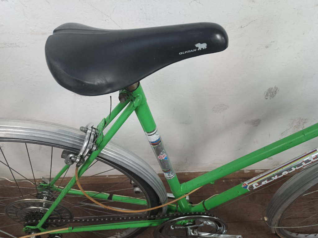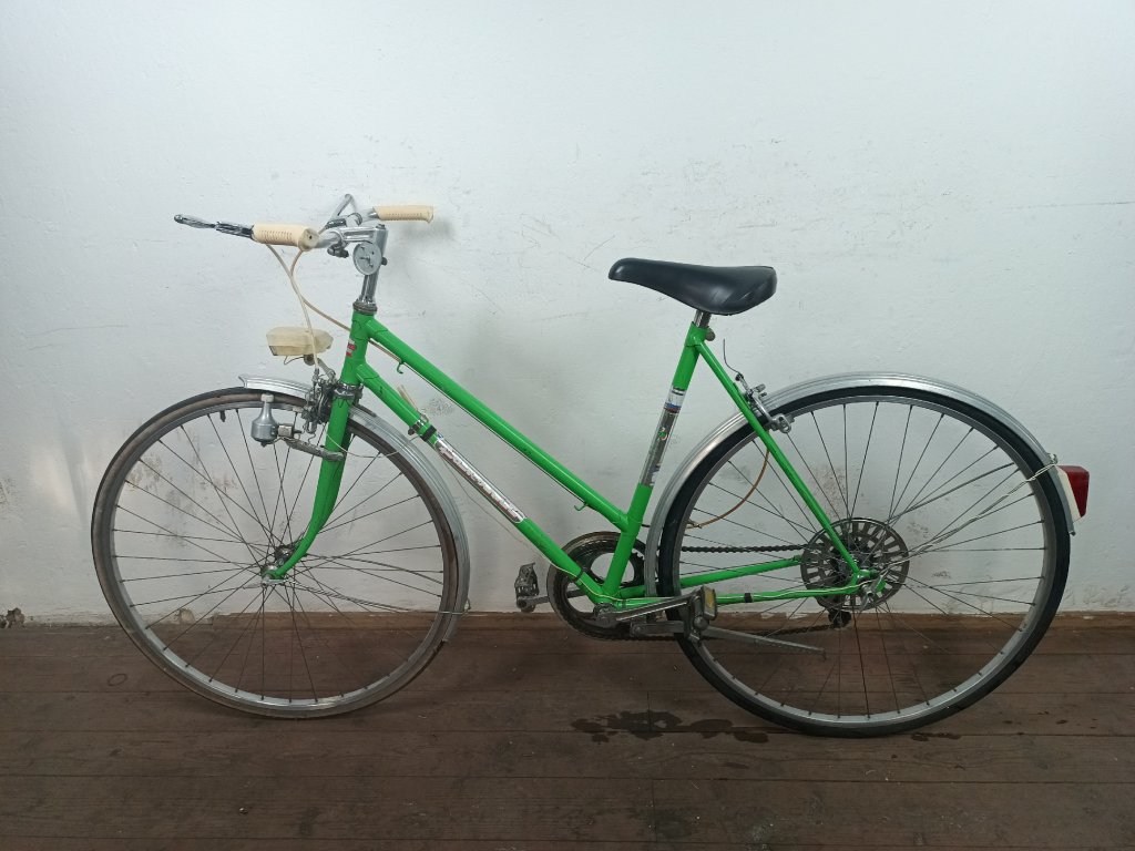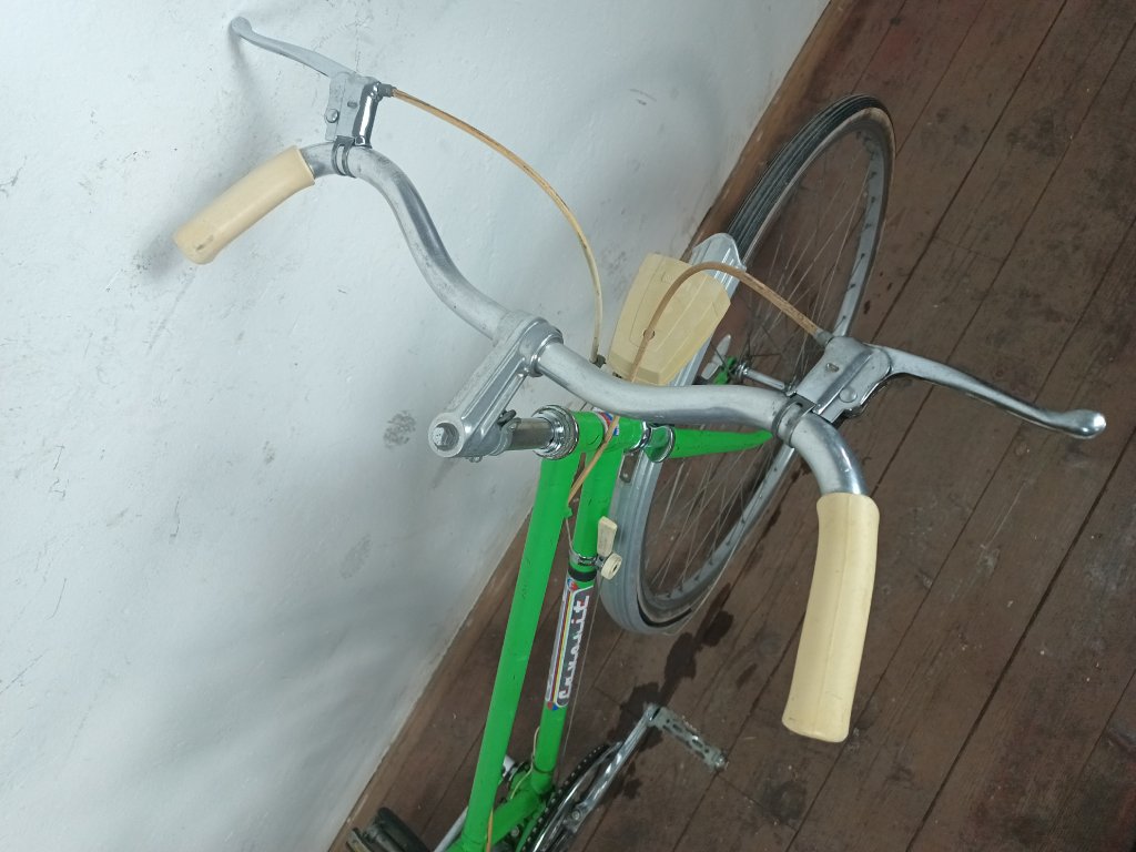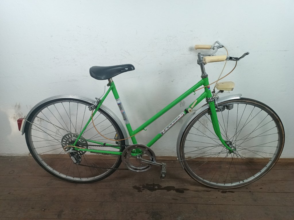 Použité dámské kolo Favorit 27". Nálezový stav, bez servisu, nepojízdné. Vcelku zachovalý lak, vůle v předním náboji a ve středovém složení. Pláště zteřelé, ale zatím drží, přední světlo svítí. Pláště 32-630, 27x1,1/4.