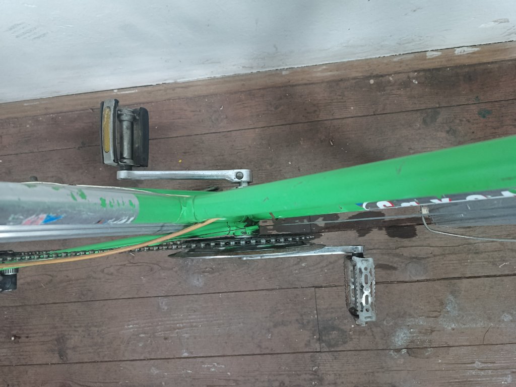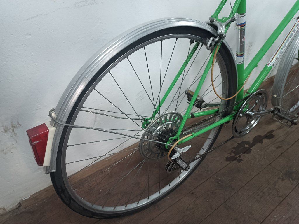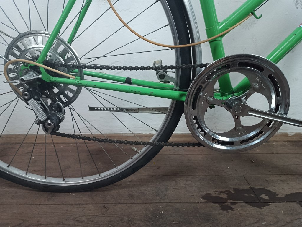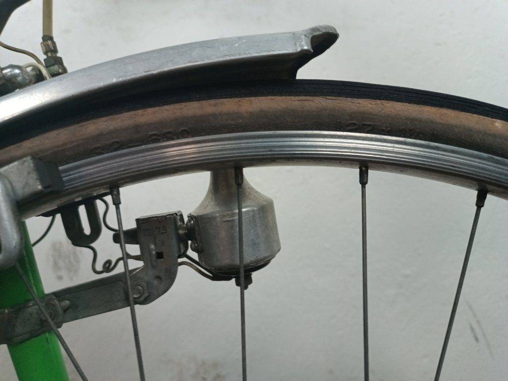 Použité dámské kolo Favorit 27". Nálezový stav, bez servisu, nepojízdné. Vcelku zachovalý lak, vůle v předním náboji a ve středovém složení. Pláště zteřelé, ale zatím drží, přední světlo svítí. Pláště 32-630, 27x1,1/4.