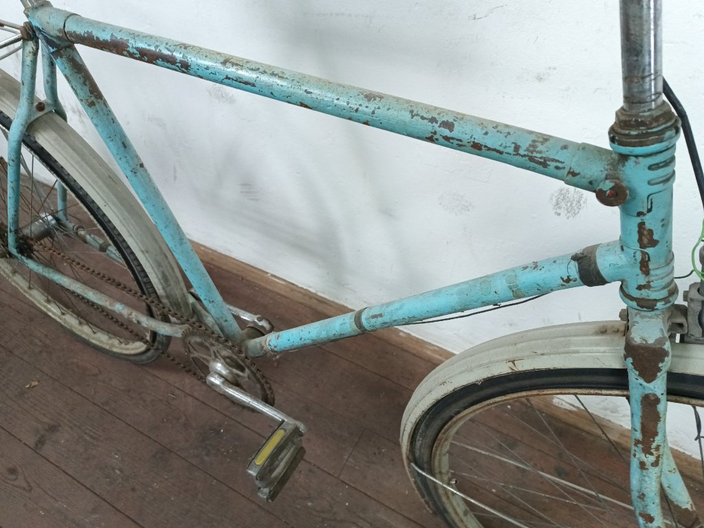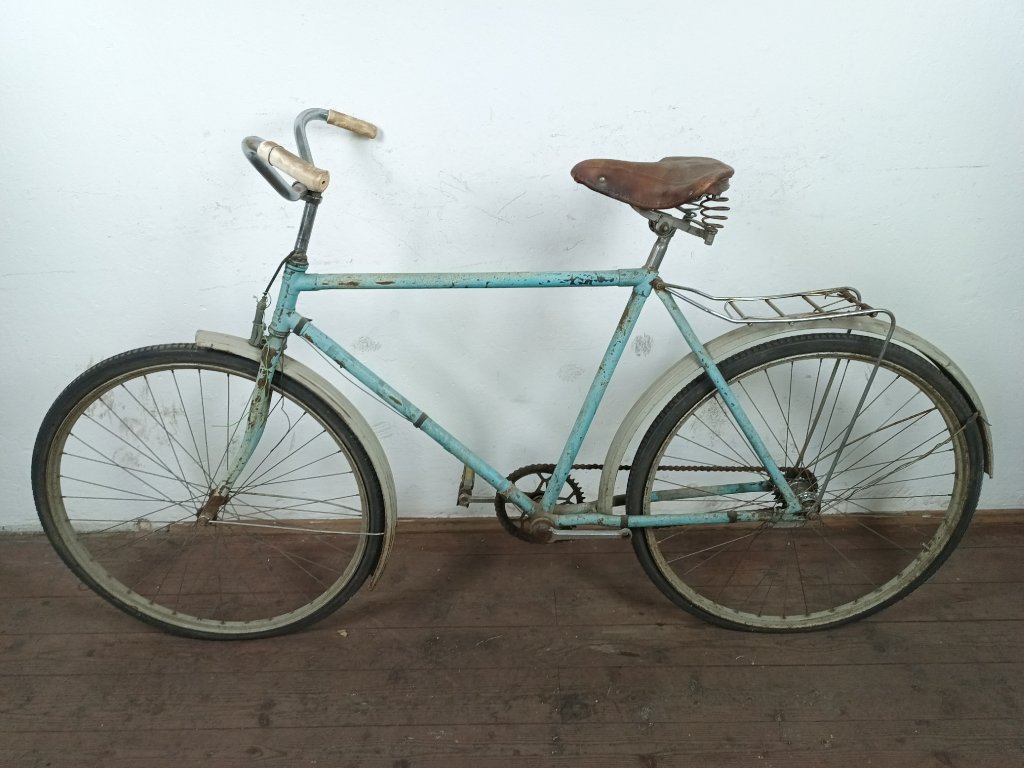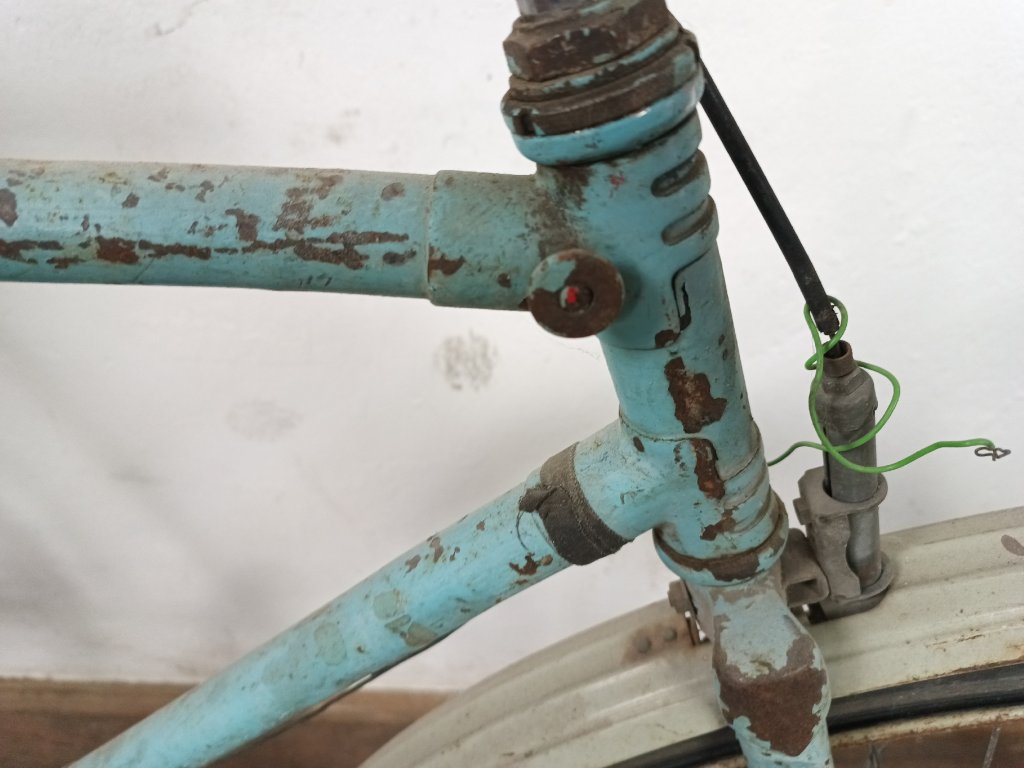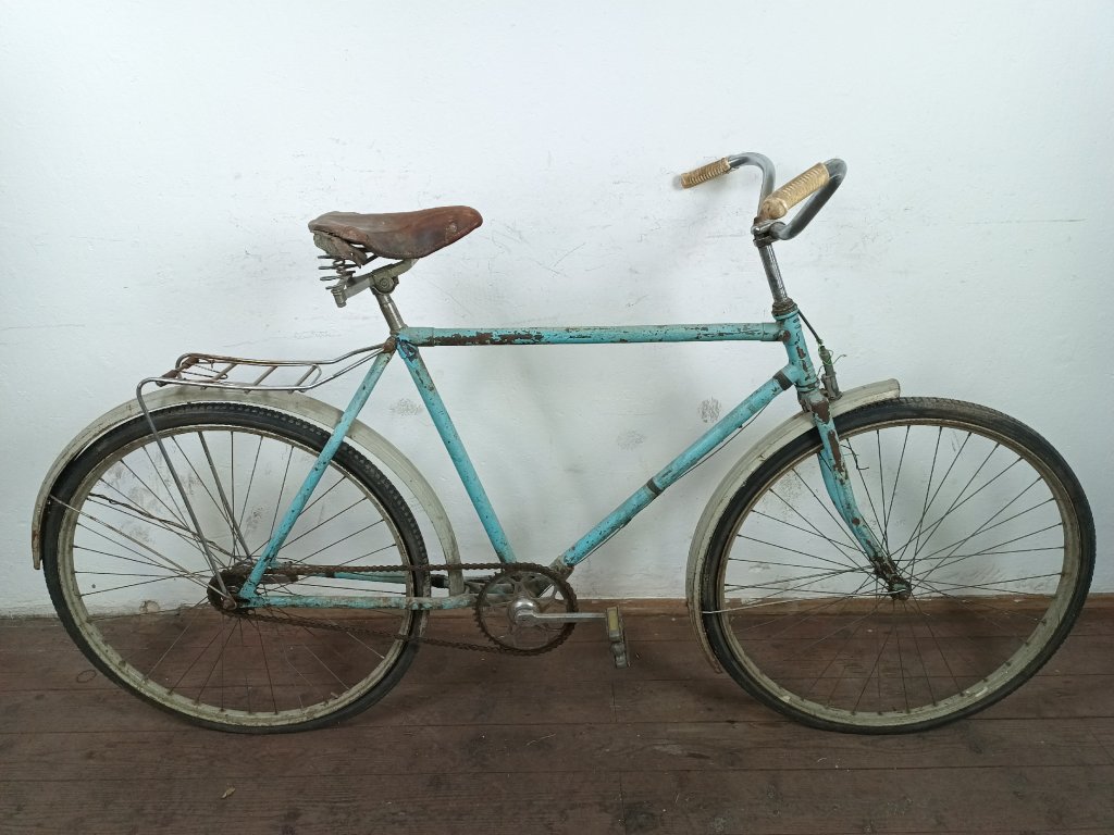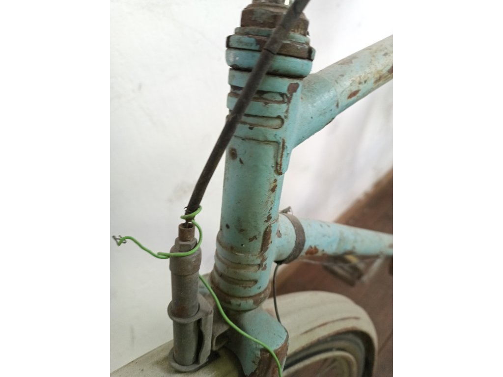 Použité historické kolo Premier Works, nálezový stav, zřejmě ohnutá přední vidlice, levá klika zavařená k ose.