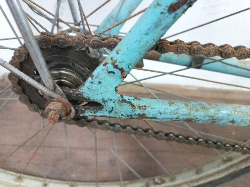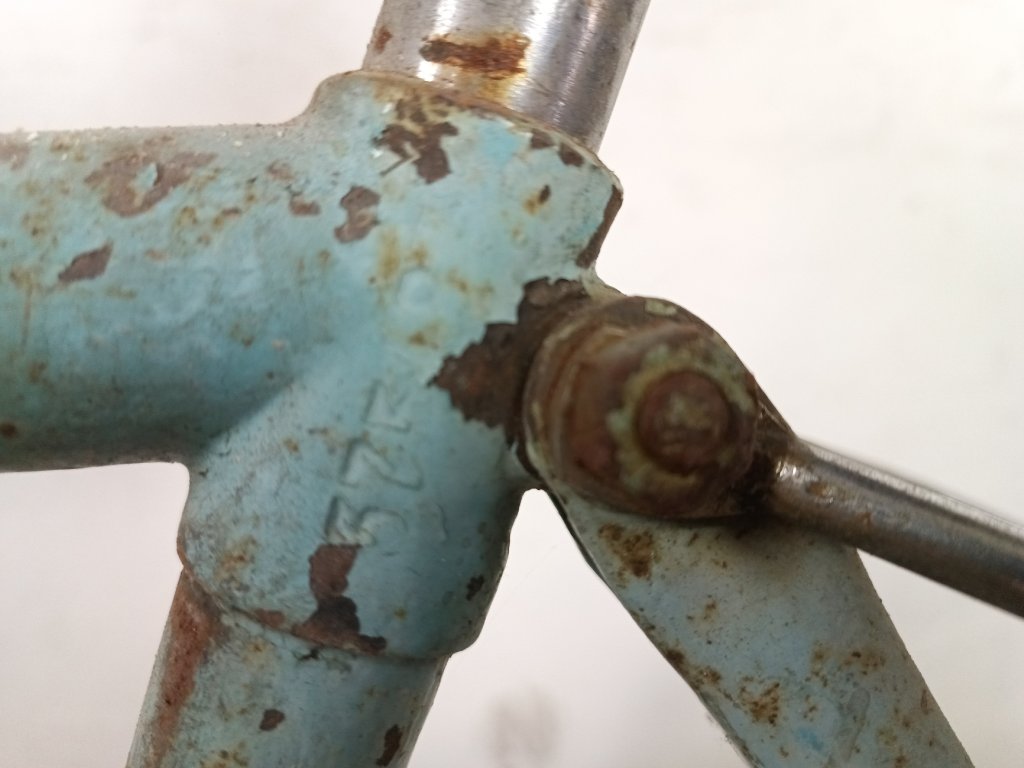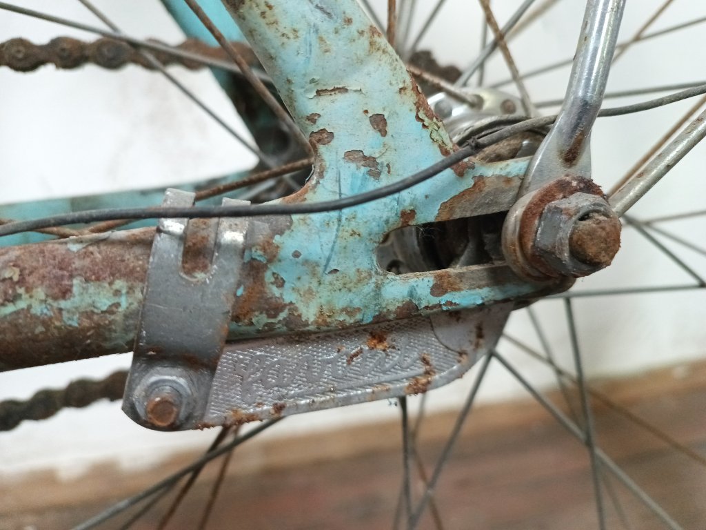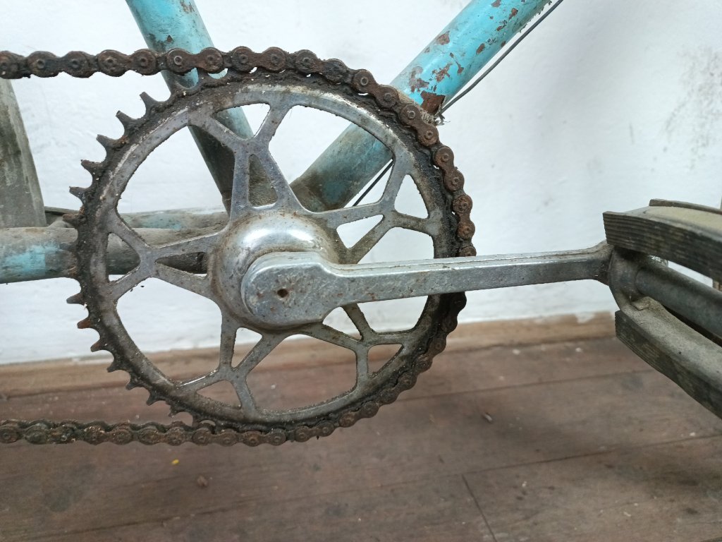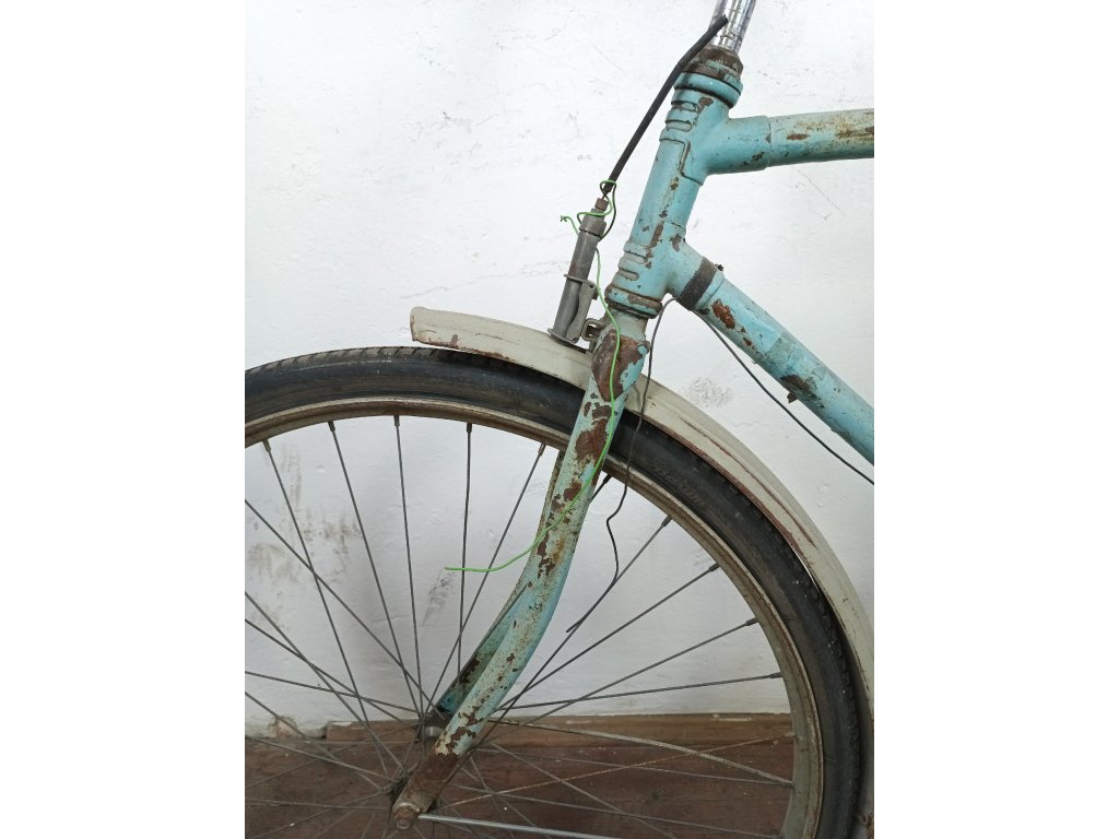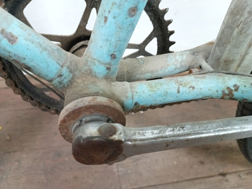 Použité historické kolo Premier Works, nálezový stav, zřejmě ohnutá přední vidlice, levá klika zavařená k ose.