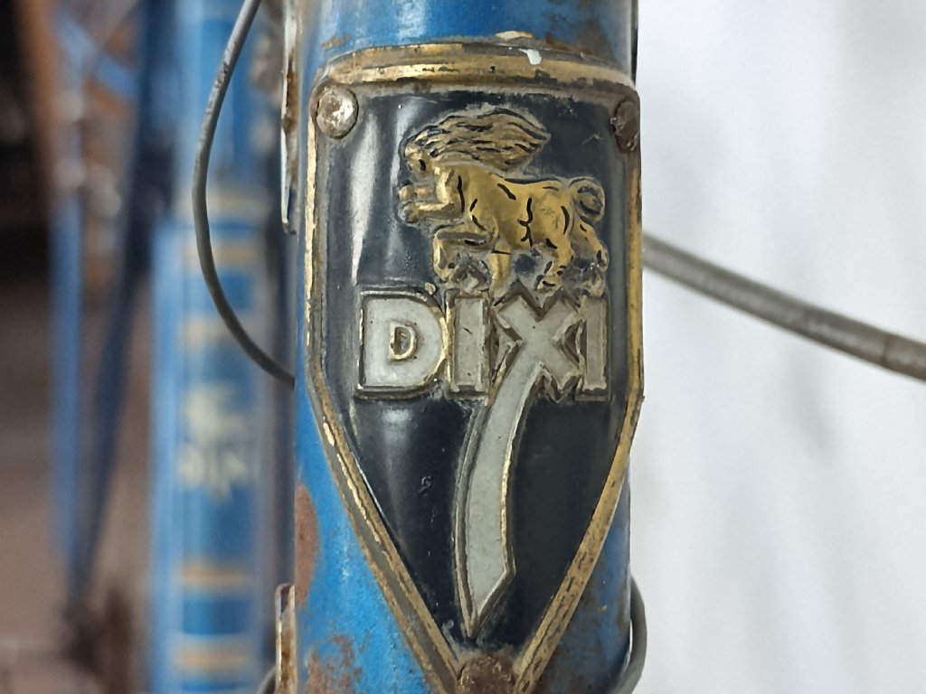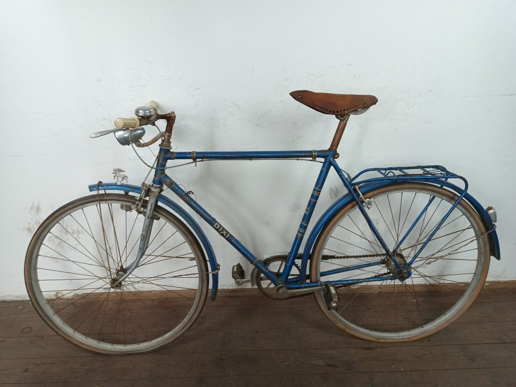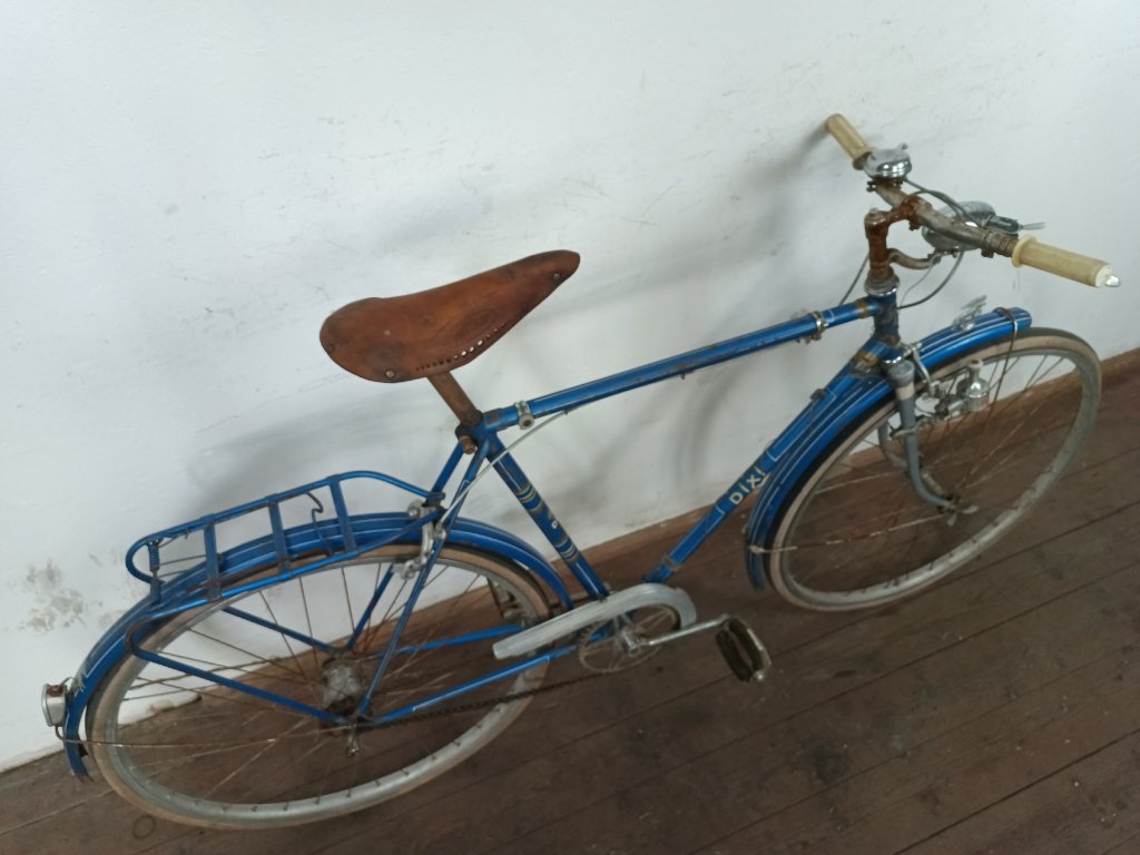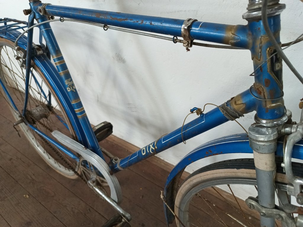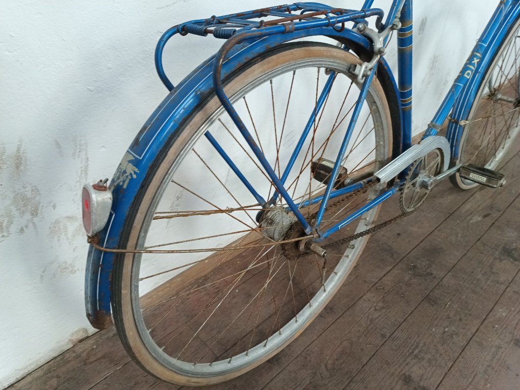 Použité vintage městské kolo německého výrobce s logem Dixi. Kola Dixi se původně vyráběla mezi světovými válkami. Poválečné použití loga Dixi s postavou kentaura bylo zřejmě pouhé kopírování jinými výrobci. Nálezový stav, nepojízdné. Přední vidlice možná nepůvodní. Silnější známky koroze, pro přestavbu je použitelné.