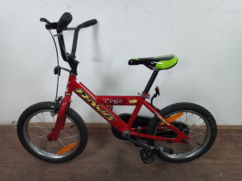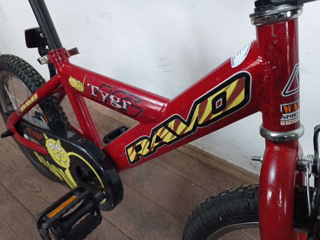 Použité dětské kolo Ravo Tygr 16", ocelový rám, repasováno (proveden kompletní servis), plně pojízdné. Nové lanko, bowden, pláště, sedlo.
