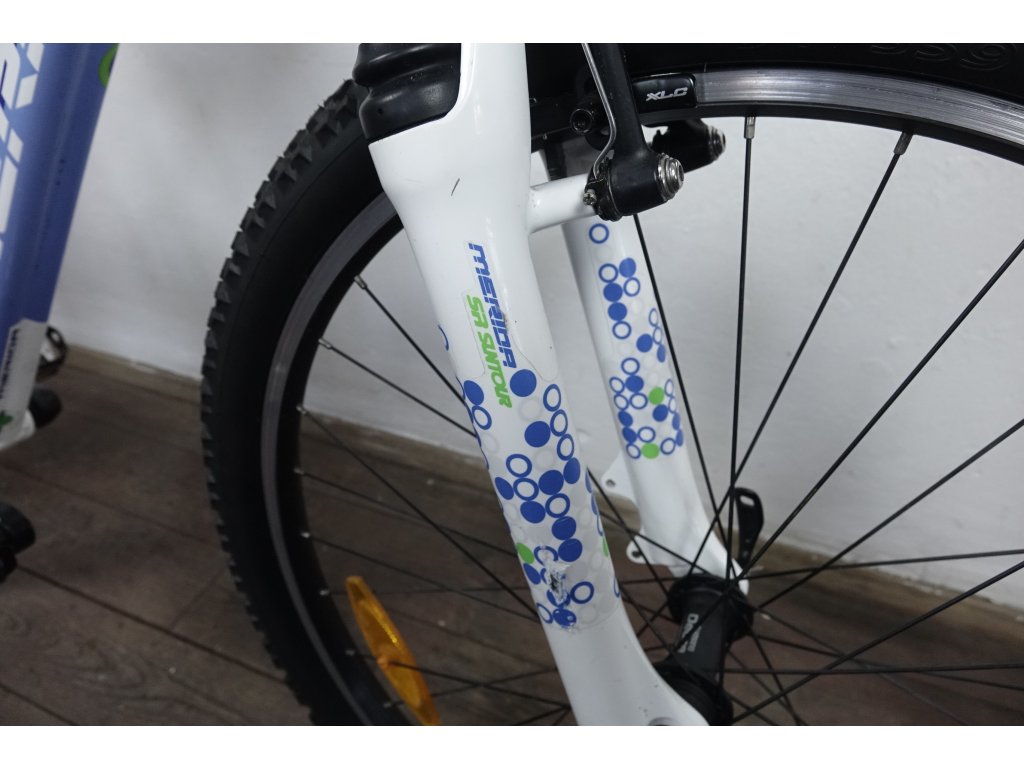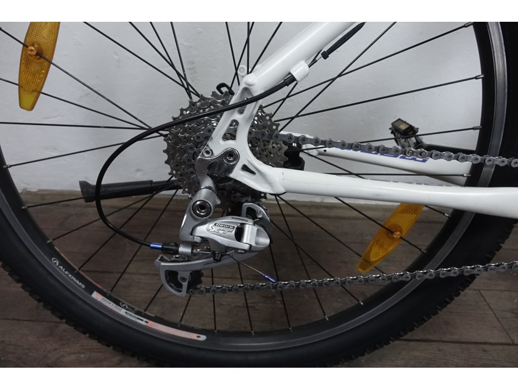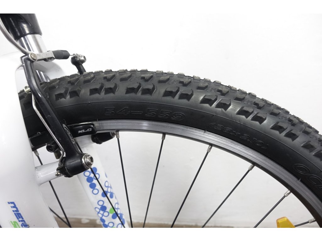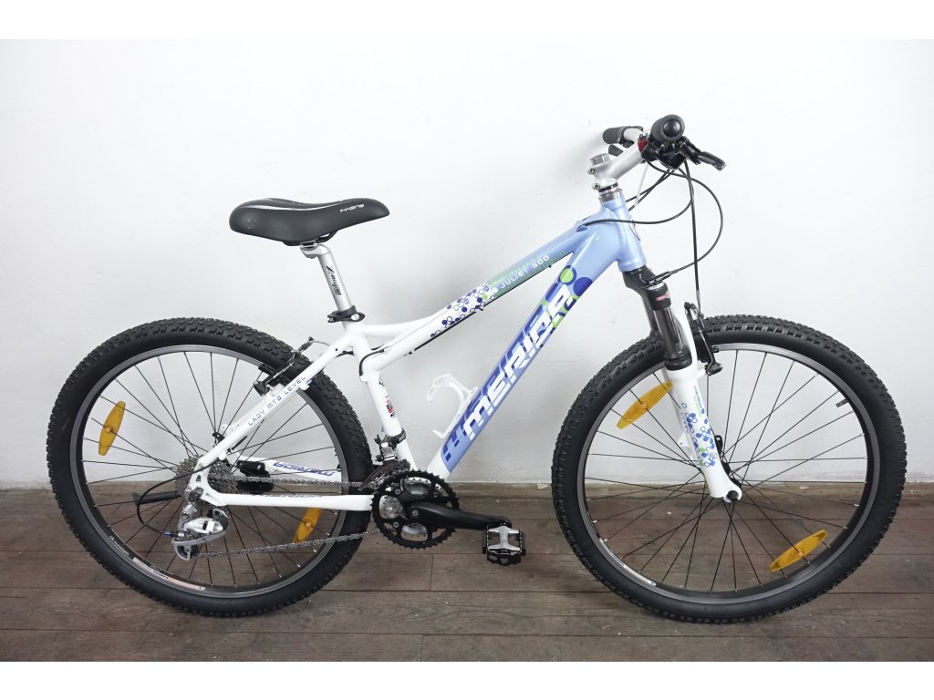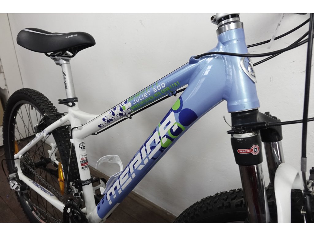 Použité horské kolo tchajwanského výrobce Merida Juliet 500 26", hliníkový rám 16", výbava Shimano Deore a Deore XT. Repasováno (proveden kompletní servis), plně pojízdné. Nové pláště, gripy, sedlo.