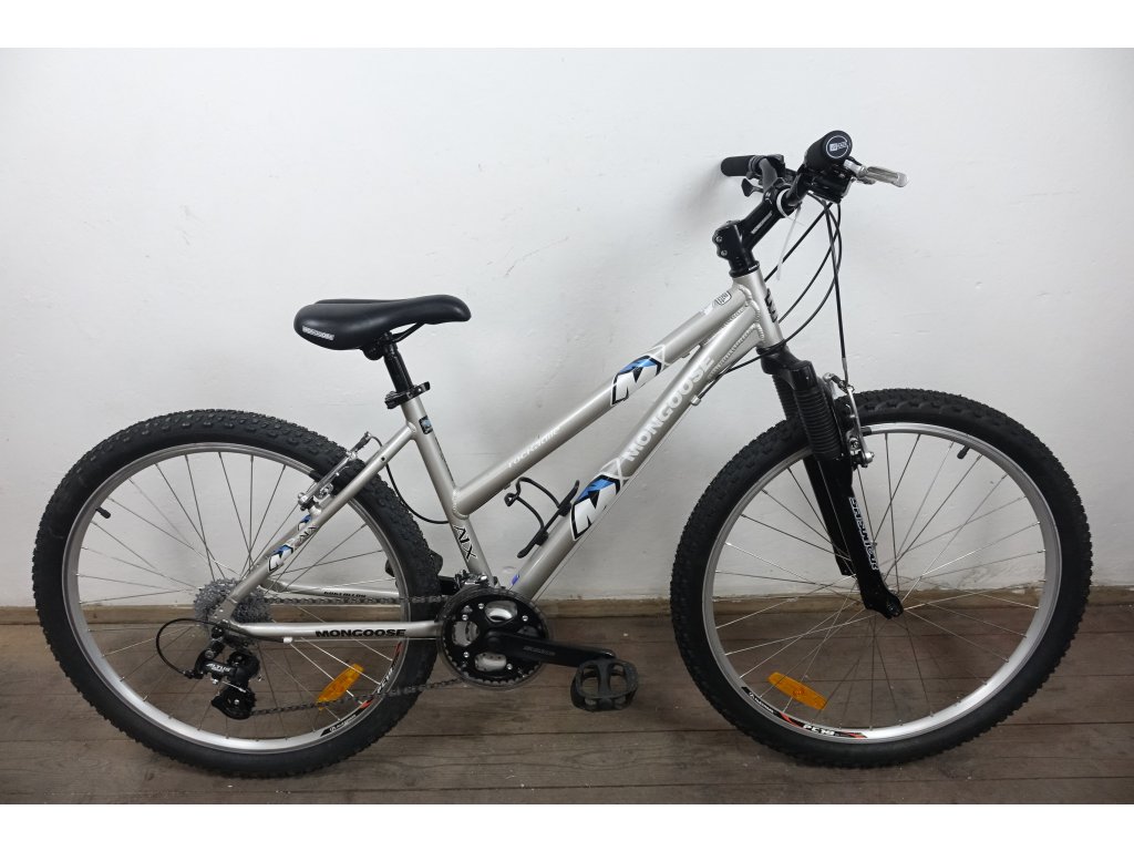 Použité dámské (dívčí) horské kolo amerického výrobce Mongoose Rockadile 26", hliníkový rám 16", repasováno (proveden kompletní servis), plně pojízdné. Nová lanka, bowdeny, pláště, brzdové špalky, gripy.