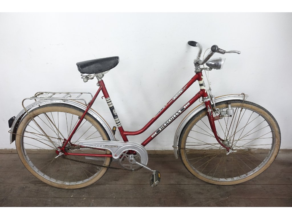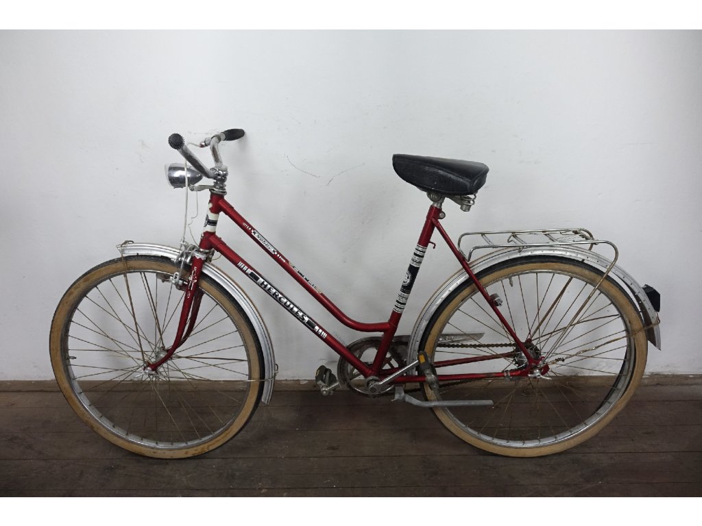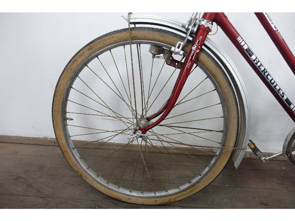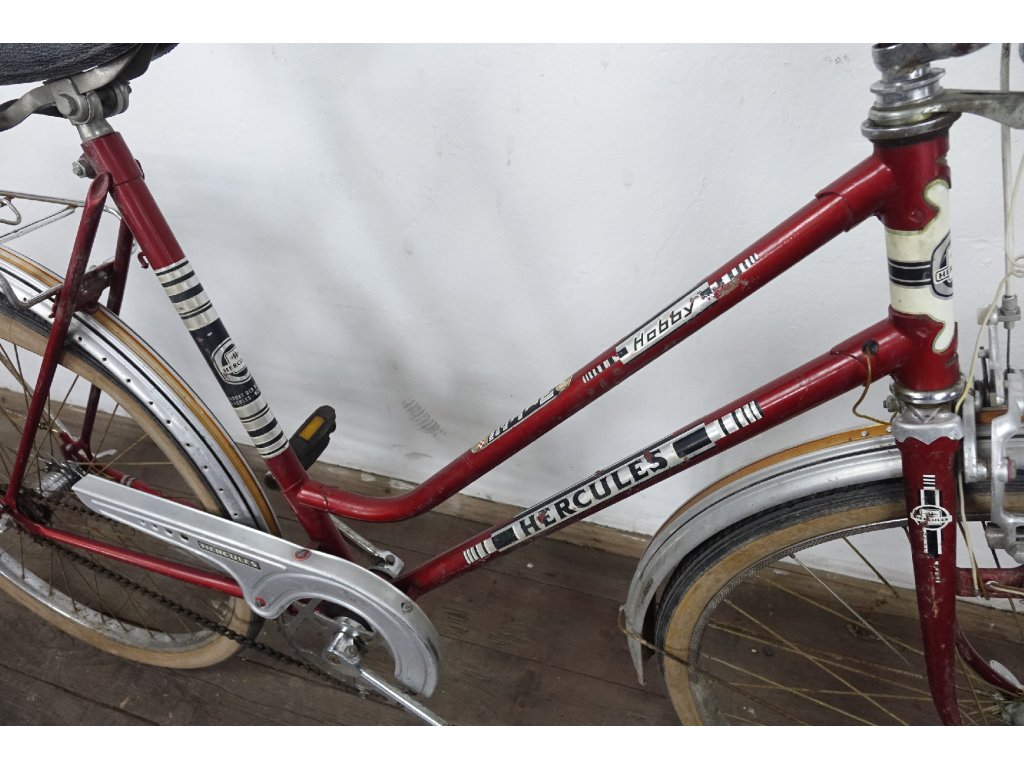 Použité dámské městské kolo německého výrobce Hercules Hobby 26". Nálezový stav, nepojízdné, známky koroze, pláště zteřelé.