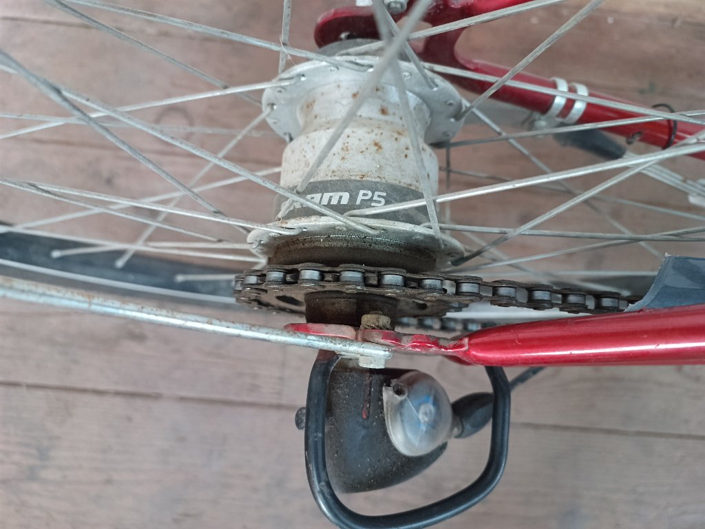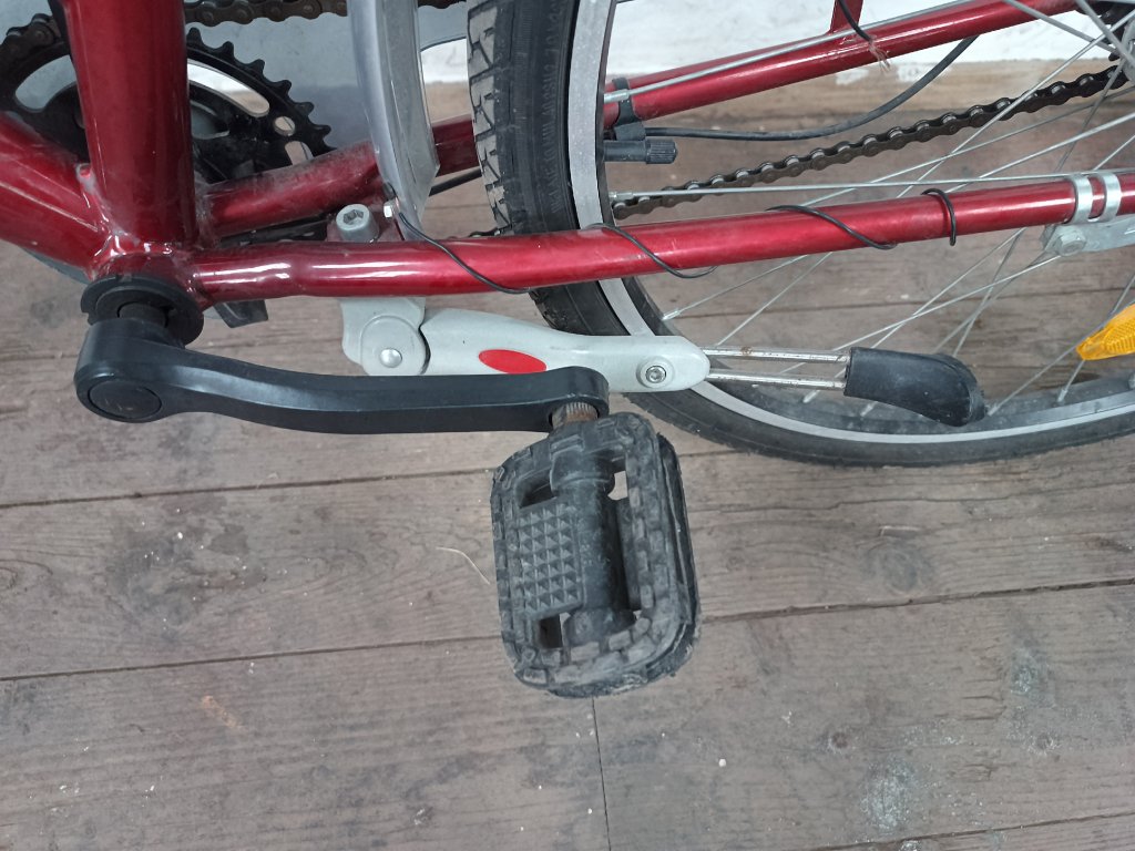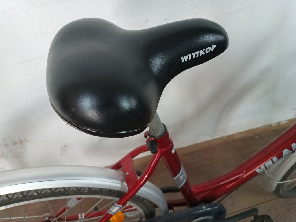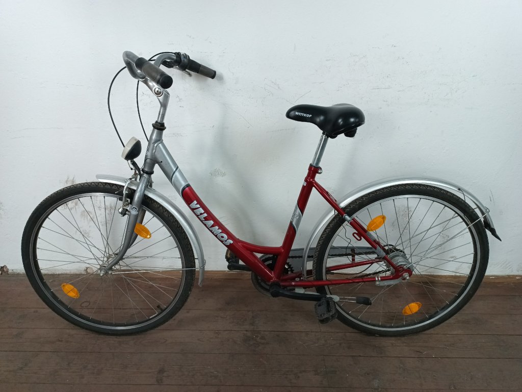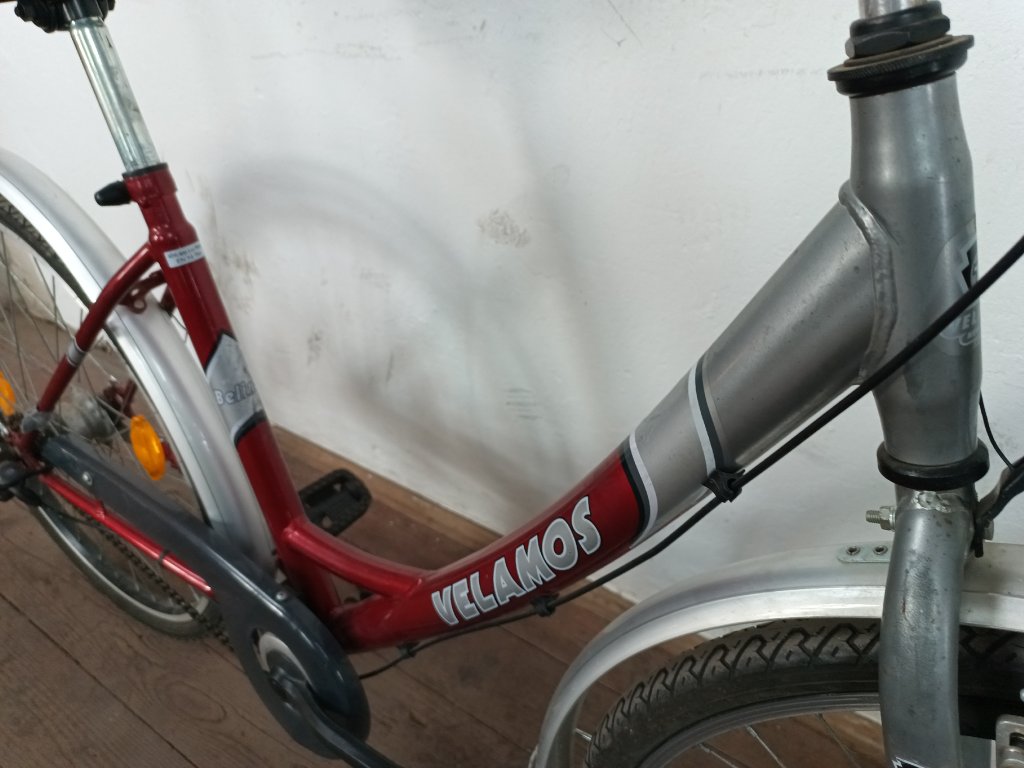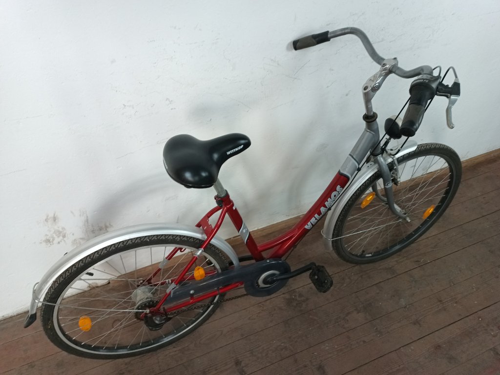 Dámské městské kolo Velamos Belinda 26", ocelový rám 46,5cm, 5 rychlostí, nálezový stav, bez servisu. Kolo je relativně v pořádku, je pojízdné, řadí, ve středovém složení je určitá vůle, pláště jsou částečně sjeté a zteřelé. Je vhodné provést na kole servis, případně vyměnit některé komponenty dle potřeby - není přesně zjištěno. Je možné využít náš servis za poplatek. Chybí zadní světlo.