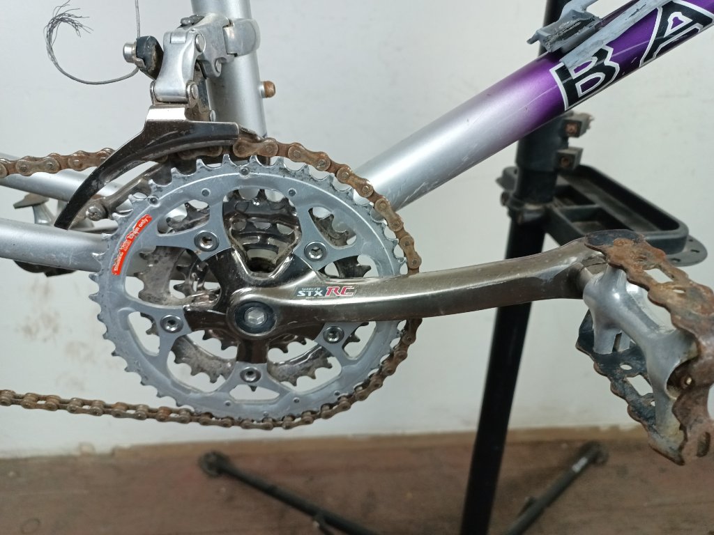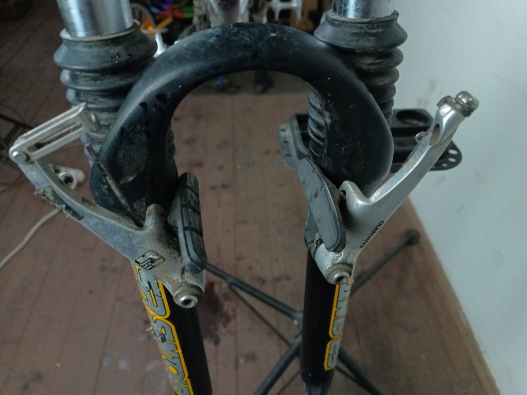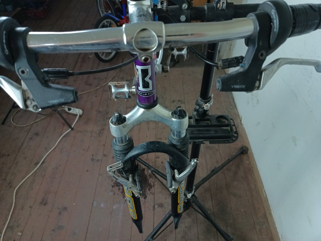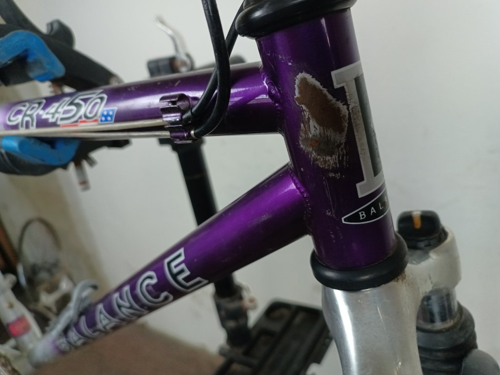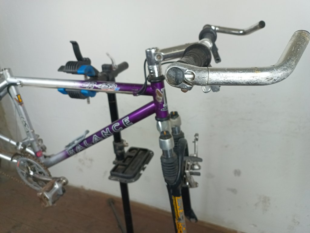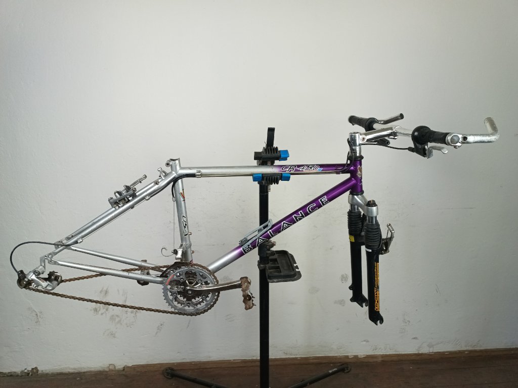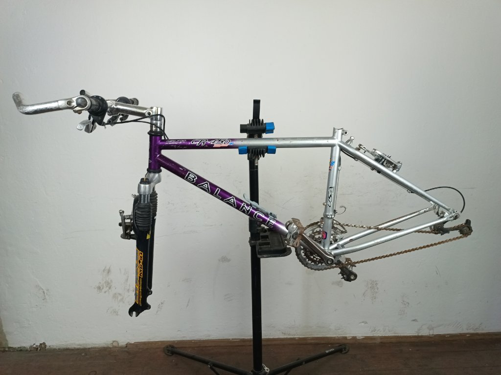 Vintage rámový set použitého horského kola amerického výrobce z devadesátých let Balance CR450 26", Cr-Mo rám 16". Zřejmě nepůvodní přední vidlice, brzdy. Komponenty Shimano STX RC.