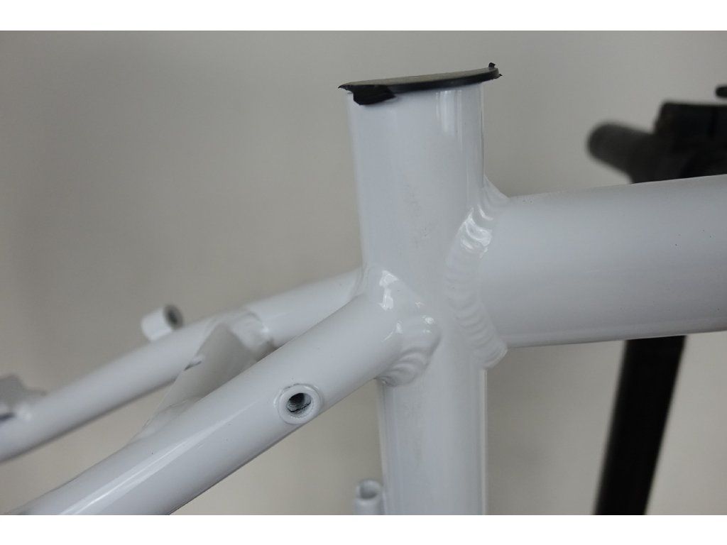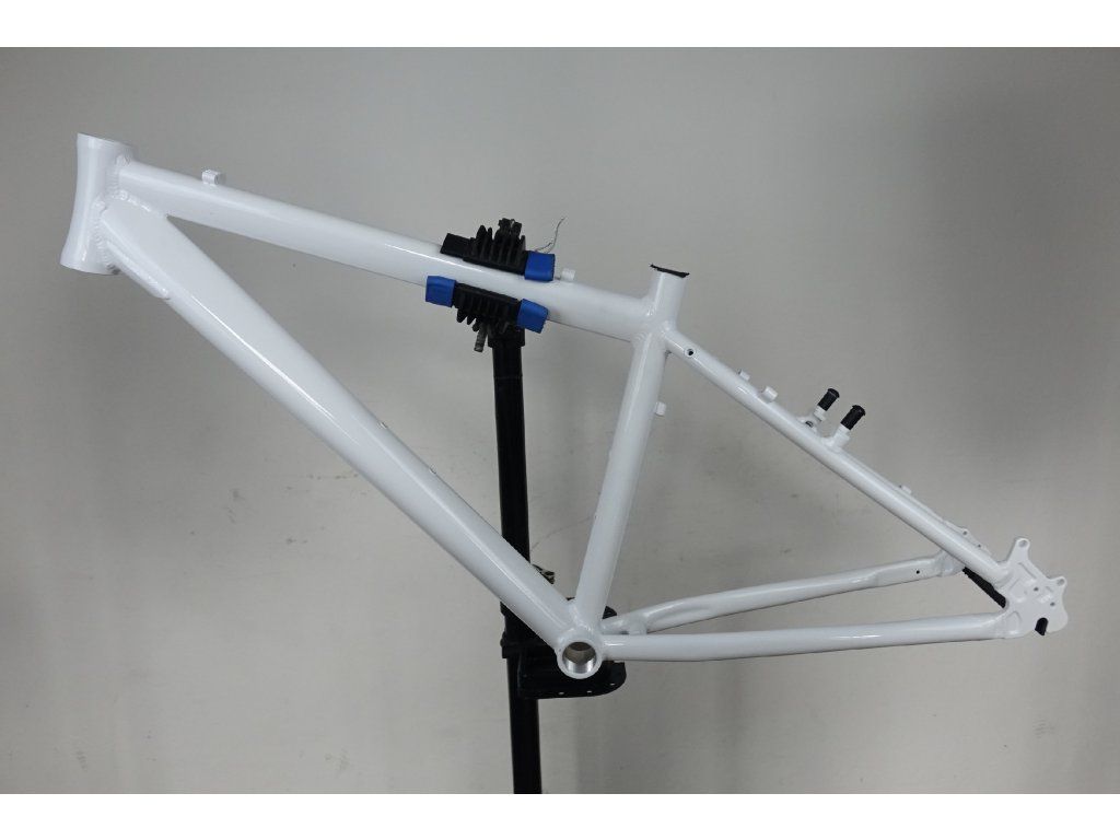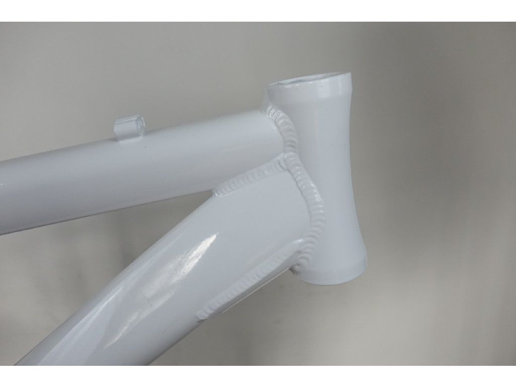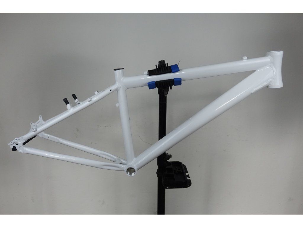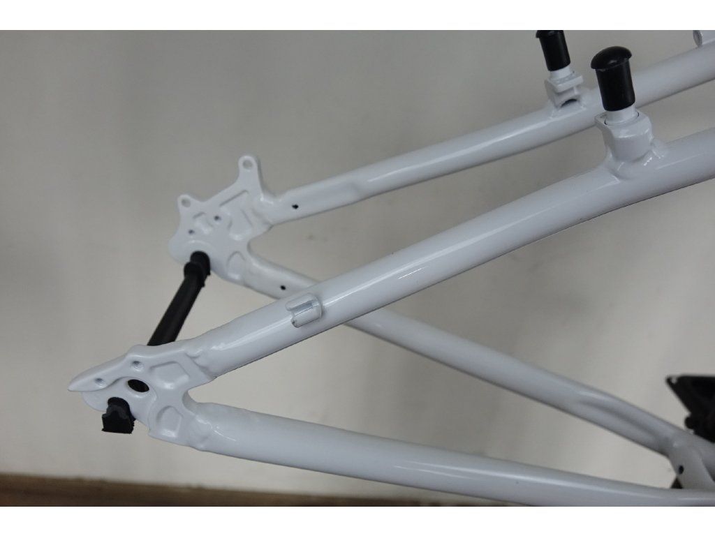 Zřejmě nepoužitý přelakovaný hliníkový rám pro horské kolo 26", velikost 15". Průměr hlavy 44 mm (1 1/8"), délka 12 cm, průměr sedlovky 27,6 mm. Pro kotoučové, i "V" brzdy. Rám může nést známky nečistot, či drobných oděrek vlivem dlouhodobějšího skladování a transportu.