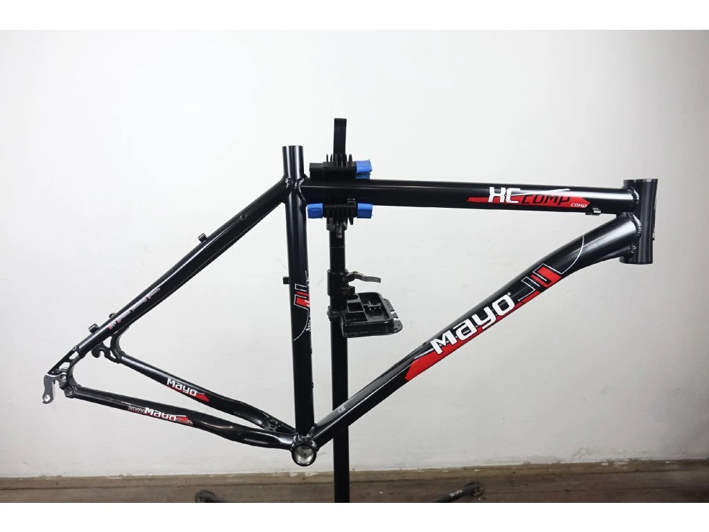 Nepoužitý hliníkový rám pro horské kolo slovenského výrobce Mayo XC Comp 26", velikost 21". Průměr hlavy 44 mm (1 1/8"), délka 14 cm, průměr sedlovky 31,6 mm. Pro kotoučové brzdy. Rám může nést známky nečistot, či drobných oděrek vlivem dlouhodobějšího skladování a transportu.