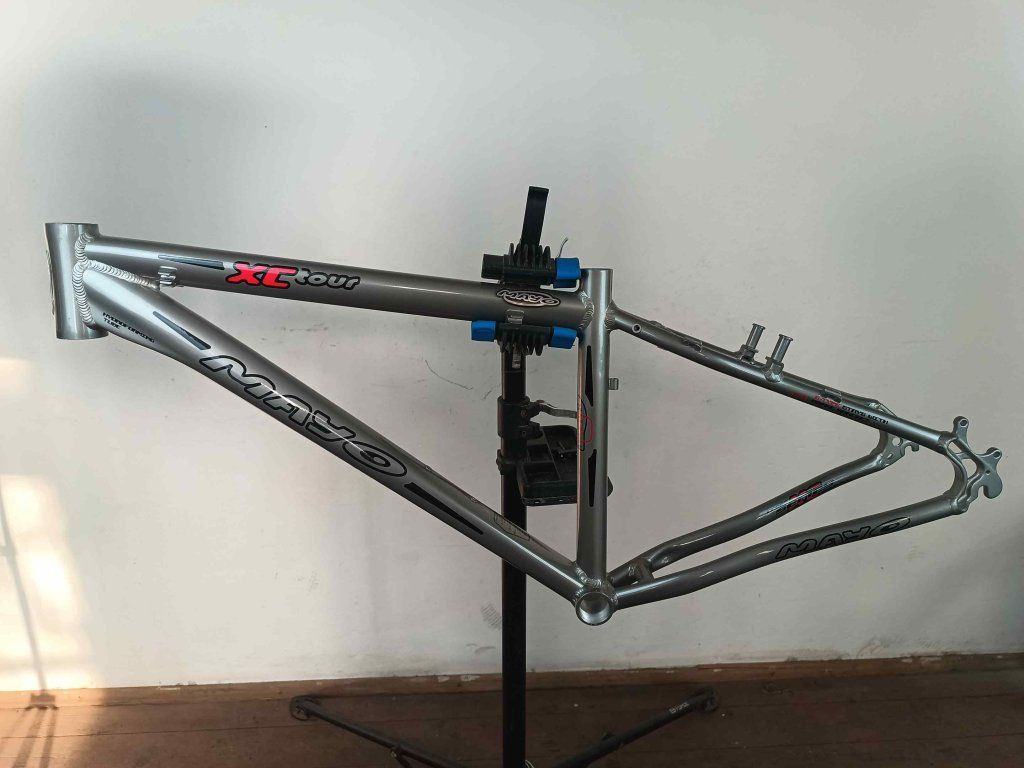Nepoužitý hliníkový rám pro horské kolo slovenského výrobce Mayo XC Sport 26", velikost 15". Průměr hlavy 44 mm (1 1/8"), délka 12 cm, průměr sedlovky 31,6 mm. Pro kotoučové, i "V" brzdy. Rám může nést známky nečistot, či drobných oděrek vlivem dlouhodobějšího skladování a transportu.