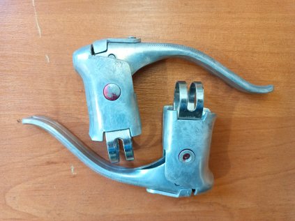 Použité brzdové páčky japonského výrobce Dia-Compe v americké licenci s posuvnou částí pro snadnější umístění lanka. Chybí podložky pro bowden.